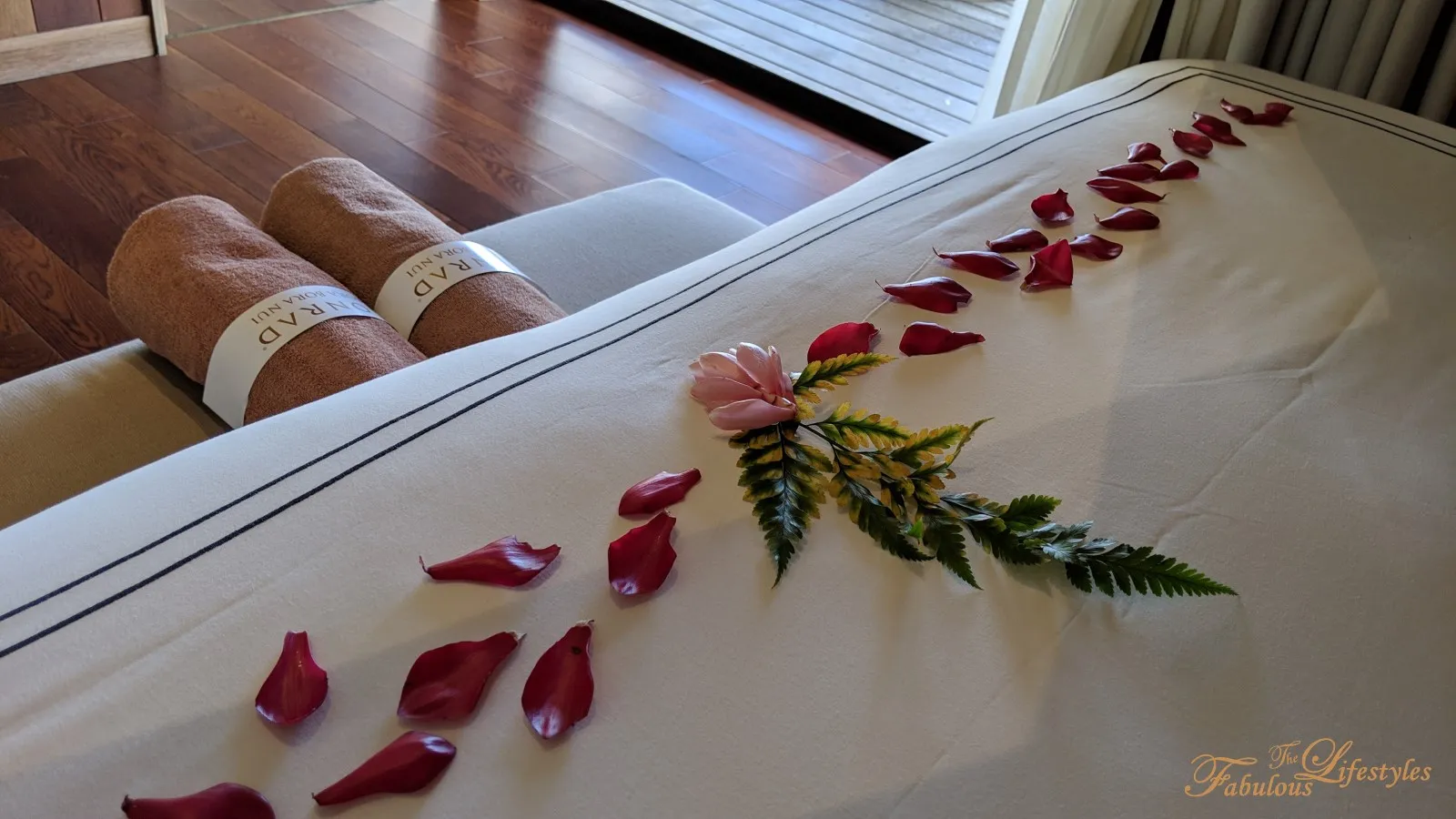 The toiletries provided are the signature "Shanghai Tang" brand used by Hilton's Conrad properties. One small detail we noticed is that the flowers in this suite are artificial orchids~ whereas the overwater bungalows feature fragrant, fresh flowers!