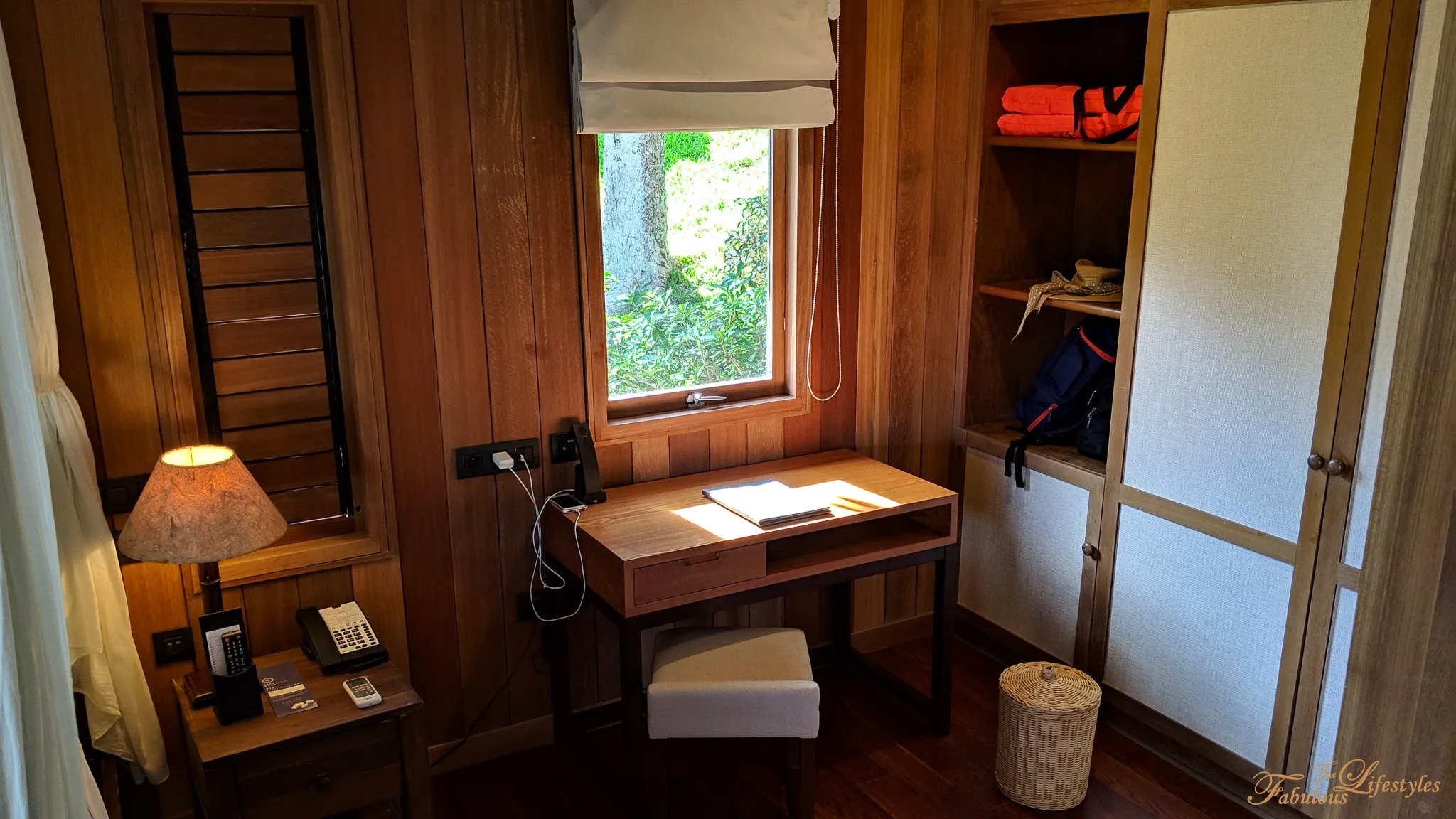 I later noticed that the interior layout of this room is almost exactly the same as the Lagoon View Suite. The only difference is in the materials used—for example, this TV wall is made of wood, whereas the Lagoon View Suite has a white wall. Overall, this room gives off much more of a forest cabin vacation vibe.
