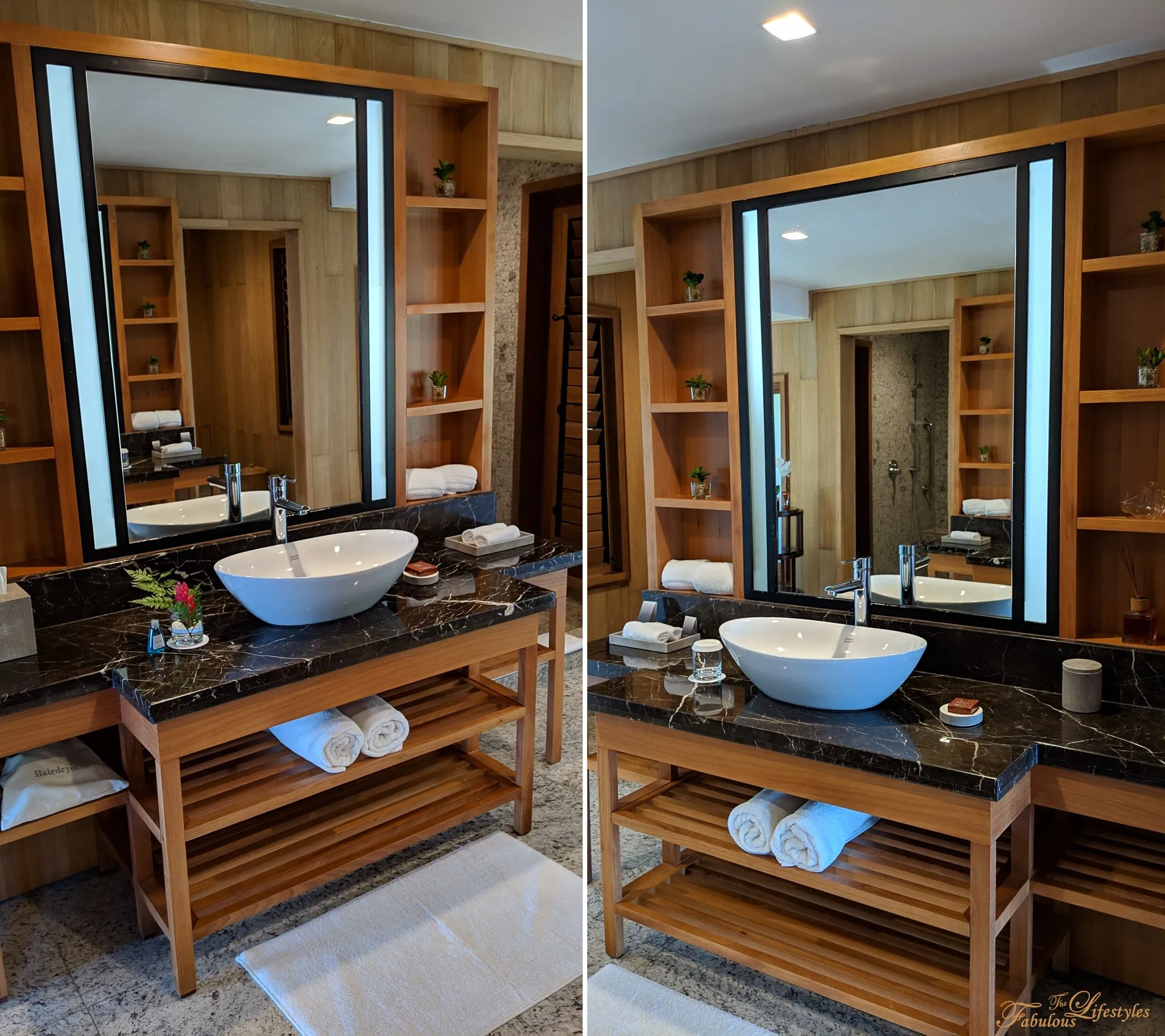 The overall space in the bathroom is slightly smaller than the one in the overwater bungalow, but it still features double vanities and a freestanding bathtub~ The design continues the room's resort cabin style, utilizing a generous amount of natural wood tones.