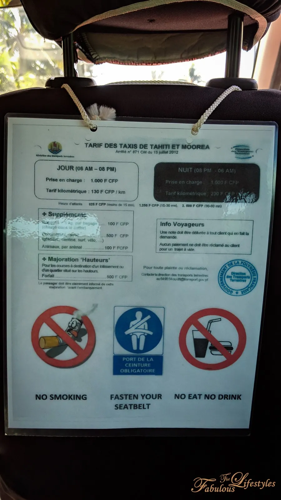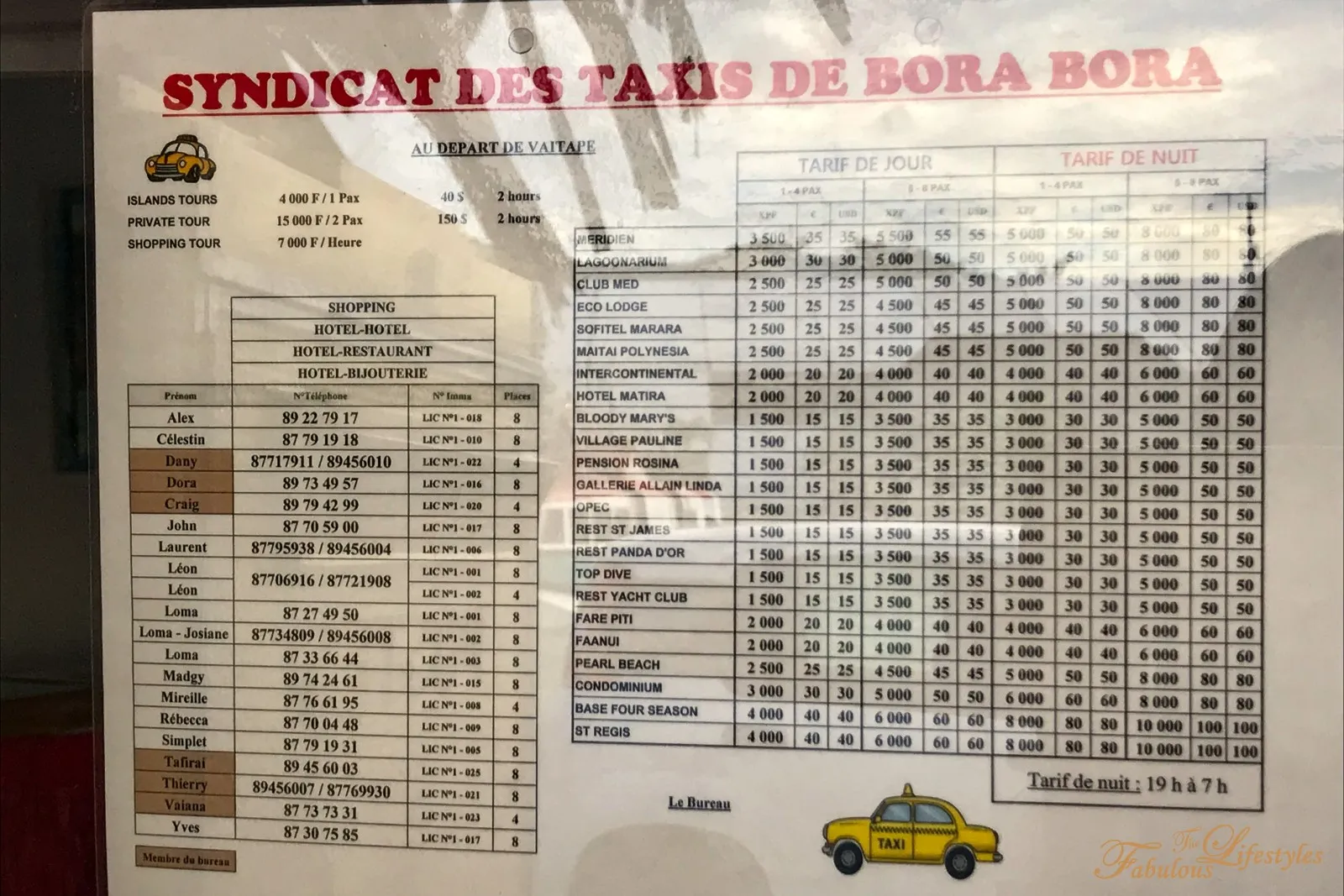 Taxi fares start at a steep $15 USD the moment you get in. Although it's expensive, the pricing is at least completely transparent! At the tourist center entrance on Vaitape, they have a poster listing all the drivers' contact info and their set prices. You can check the rates before deciding if you want to hop in!