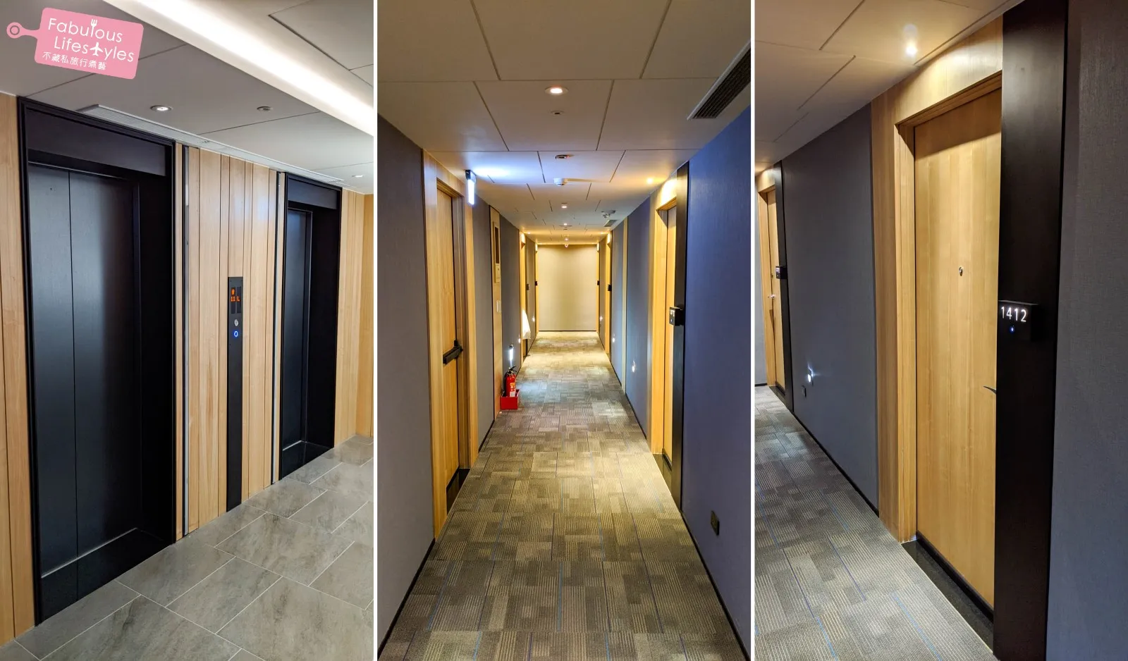 The hotel's elevators pair sleek black finishes with warm natural wood tones. The geometric patterns on the hallway carpets playfully echo the ceiling design, complete with illuminated room number signs. This chic, contemporary style had us so excited to see what the rooms looked like inside!