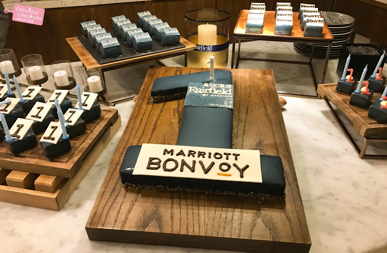 The anniversary cake was a massive "1", surrounded by adorable mini cakes decorated with 'Fairfield', 'Bonvoy', and '1' for guests to grab. Super cute!