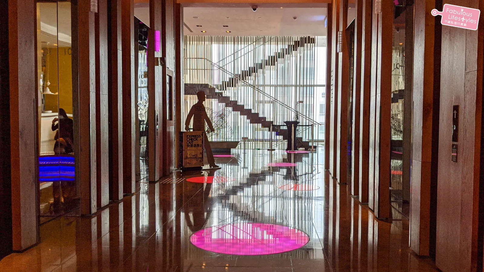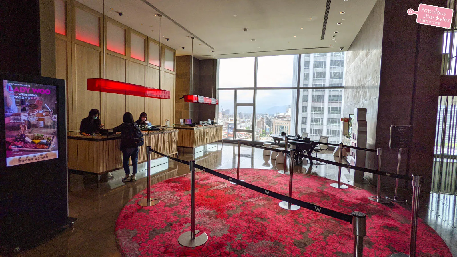 Stepping into W Taipei, you are greeted by an arrival lobby with sky-high ceilings. The entire wall and front desk feature a sleek wooden design, paired with glossy floors illuminated by scattered, circular club-style lighting. Right from this arrival lobby, it feels incredibly trendy and luxurious!