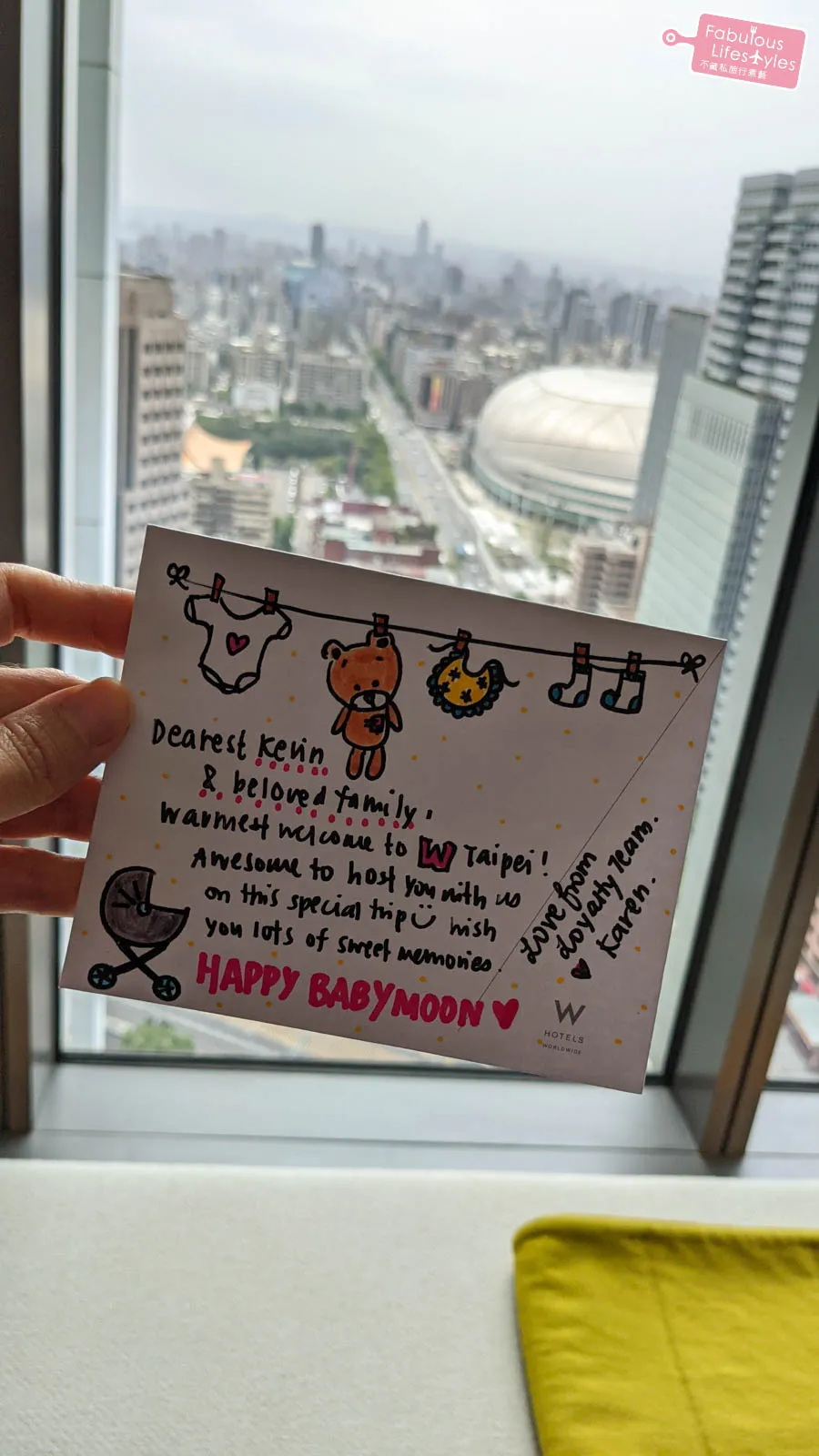 For our "Babymoon," we stayed at 7 different hotels in northern Taiwan, only to be surprised that the concept of a "Babymoon" isn't very common here. Most hotel staff heard "Babymoon" and mistakenly thought it was a baby's one-month birthday! One hotel sent us a birthday cake, while another thoughtfully set up baby amenities in the room (which was still super sweet of them 😆). No exaggeration—W Taipei was the only hotel that knew exactly what a Babymoon was! Their welcome amenity included heartwarming orange-flavored macarons and cake, along with a super, super adorable hand-drawn card!