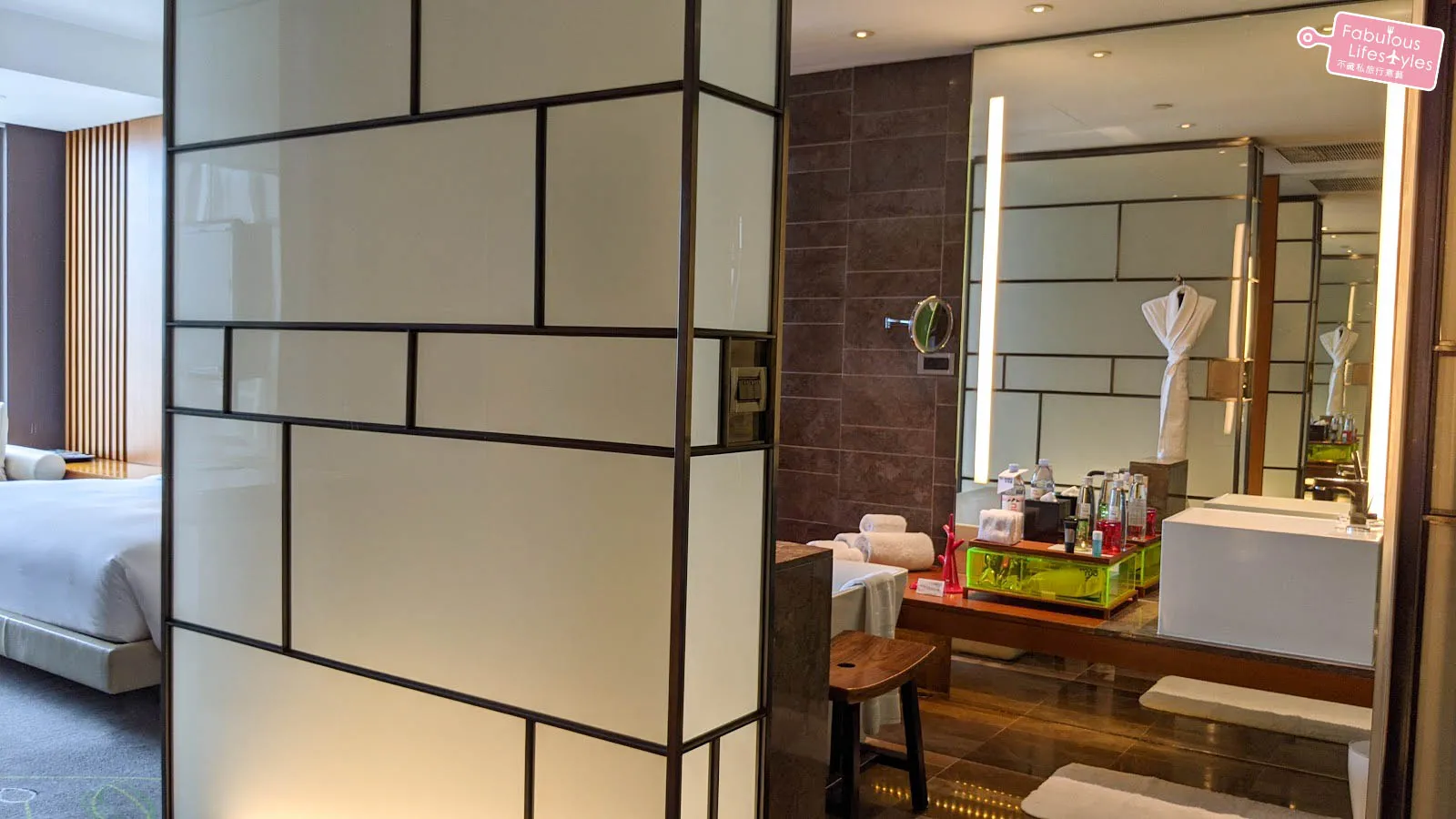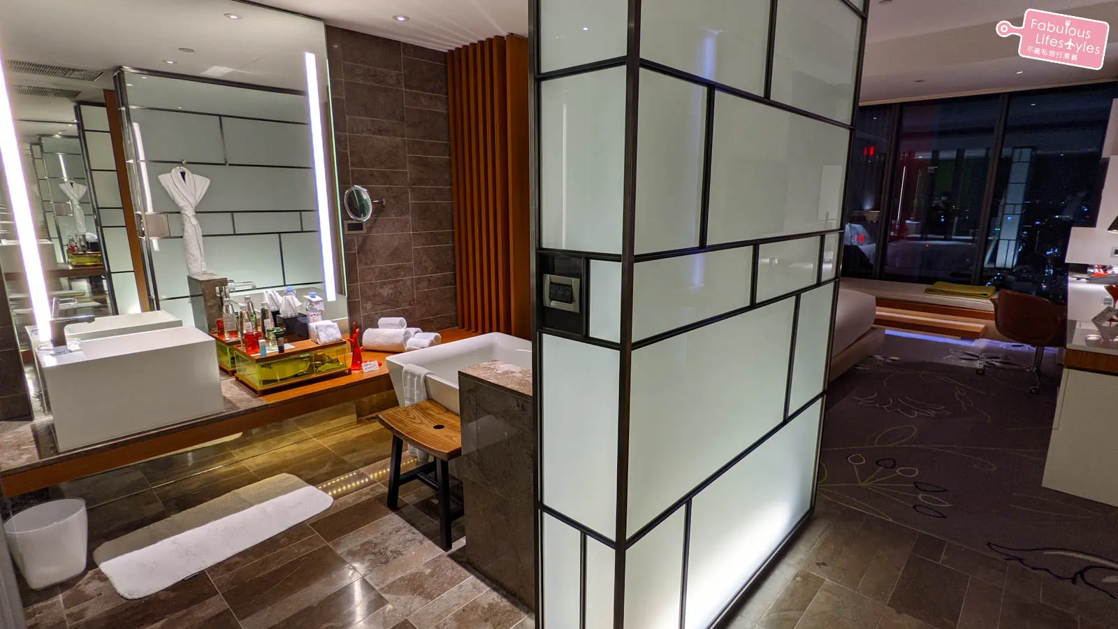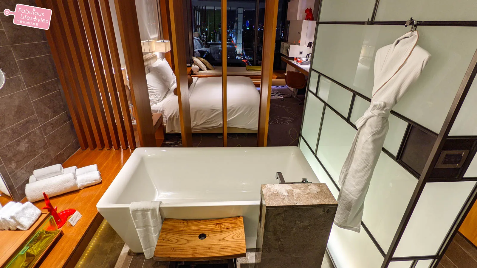 The freestanding bathtub is separated from the guest room by a "rotatable vertical wooden screen," allowing you to look right through to the room and the city view outside while soaking in the tub! The wooden material feels very high-quality. If you want some privacy, you can simply close the screen, and it instantly transforms back into a regular bathroom.