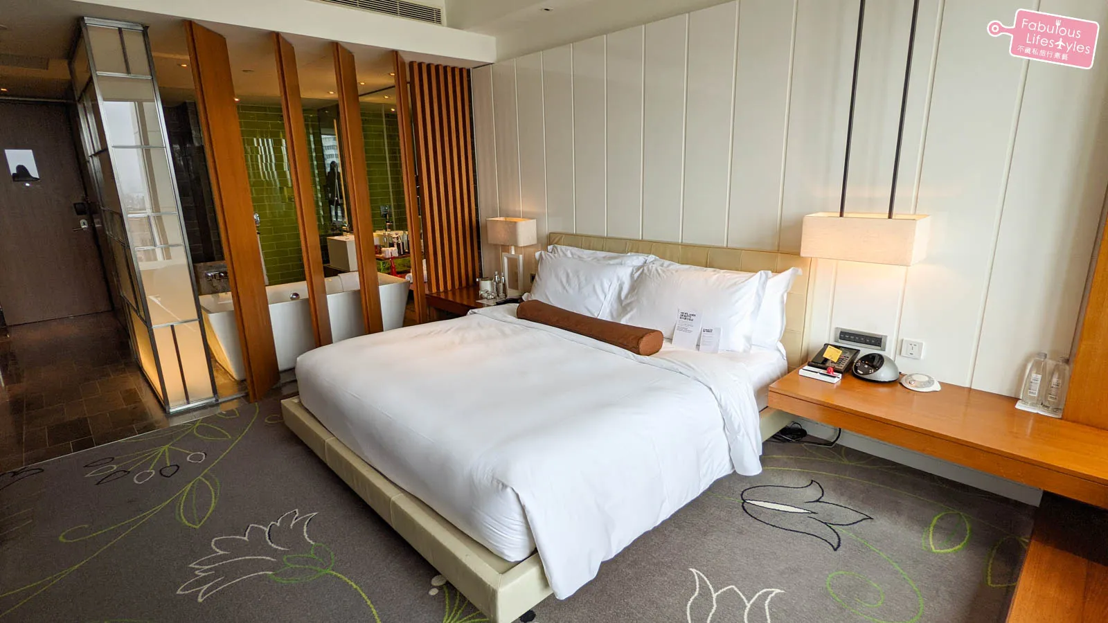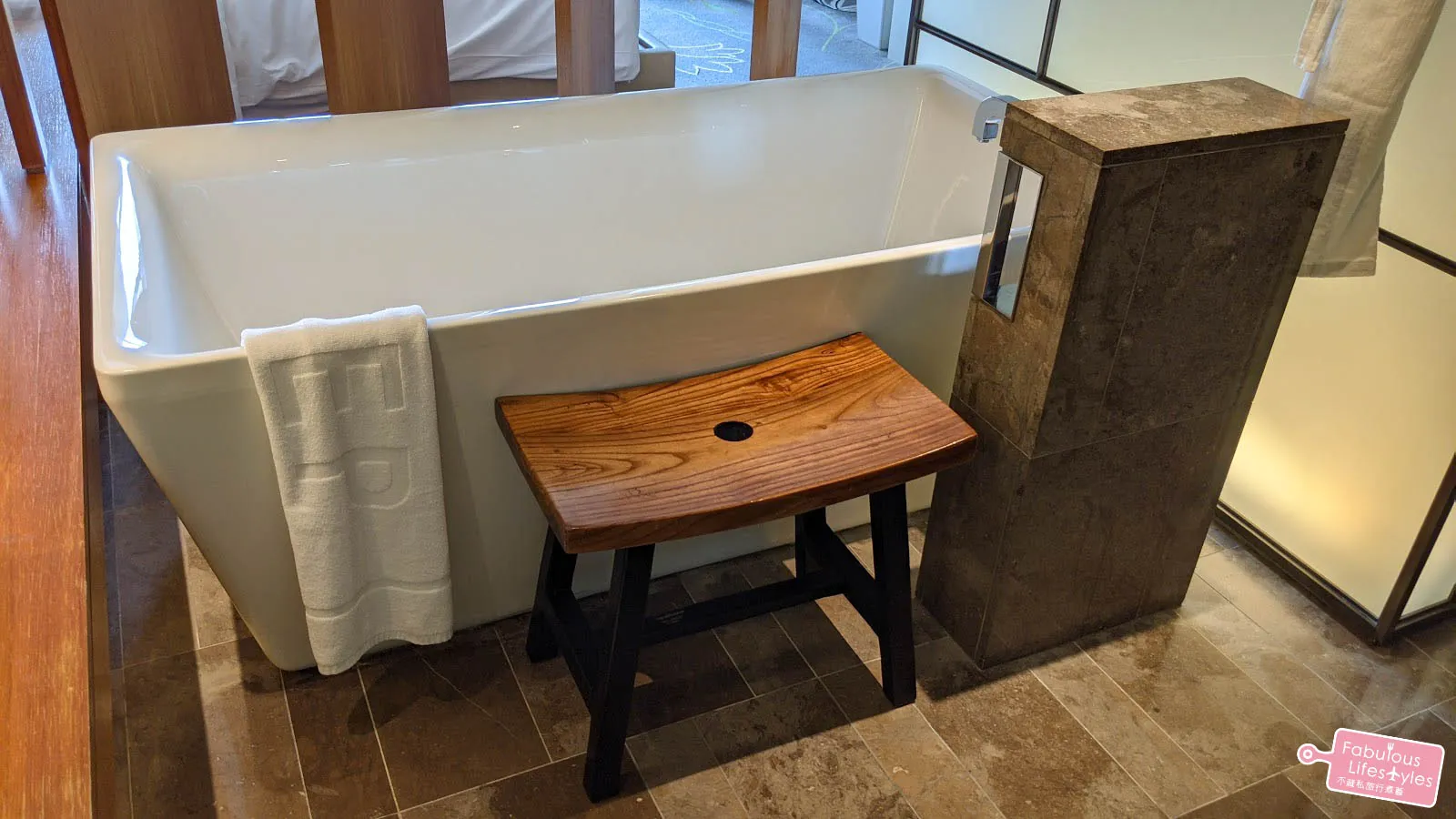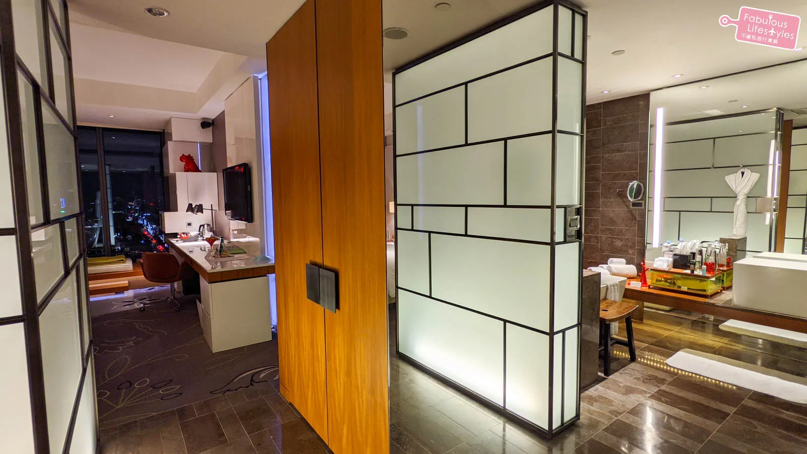 The freestanding bathtub is separated from the guest room by a "rotatable vertical wooden screen," allowing you to look right through to the room and the city view outside while soaking in the tub! The wooden material feels very high-quality. If you want some privacy, you can simply close the screen, and it instantly transforms back into a regular bathroom.
