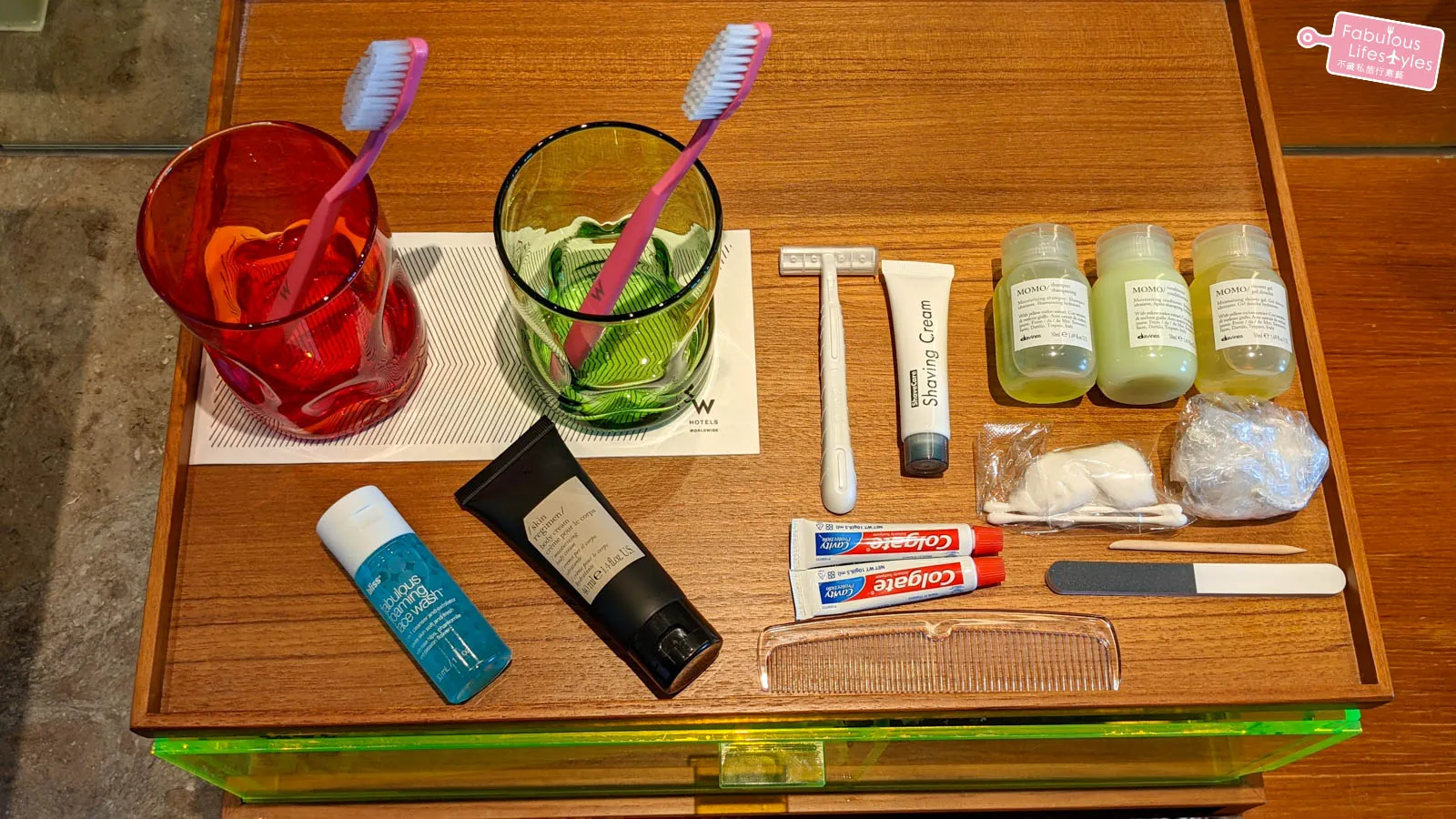 The amenities even include face wash, and it works quite well! Initially, when we saw one red and one green mouthwash cup, we assumed the toothbrushes would also be red and green. Out of sheer curiosity, we tore them open only to find both toothbrushes were red 😆 Later on, when we stayed at the Moxy Hotel in Taichung, we discovered a hotel that actually matched our logic and provided two different colored toothbrushes!