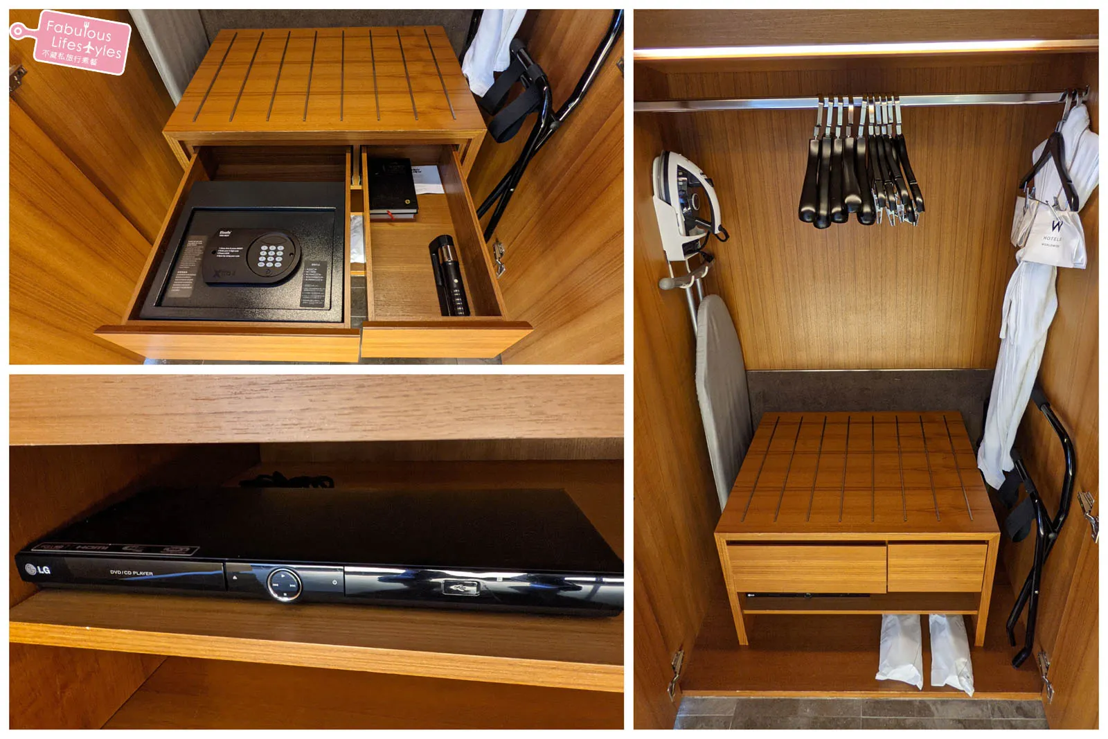 The closet near the entrance contains a safe, luggage rack, ironing board, bathrobes, and more. The most surprising find? There’s actually a DVD player! Truly a testament to the hotel’s decade of history!