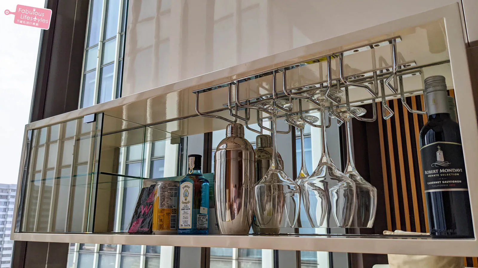 By the window, the Mini Bar features cabinets that irregularly stack from the floor all the way up to the ceiling—a highly unique design!
