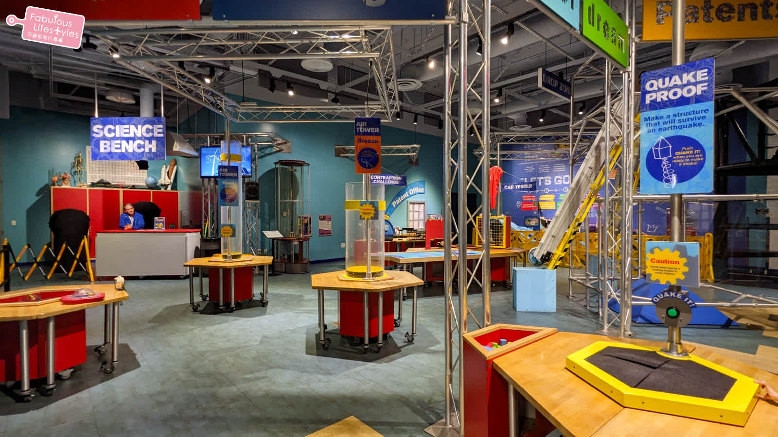 上圖這一區分成了很多不同的小桌子,每個桌子都有遊戲可以玩,我們玩了其中一個有關地震的遊戲,遊戲主要就是讓小朋友動動腦用桌子上提供的玩具建造一個防震的建築物~建造完成後按一個按鈕,桌面就會開始震動,測驗小朋友建造的建築物會不會倒,相當有趣