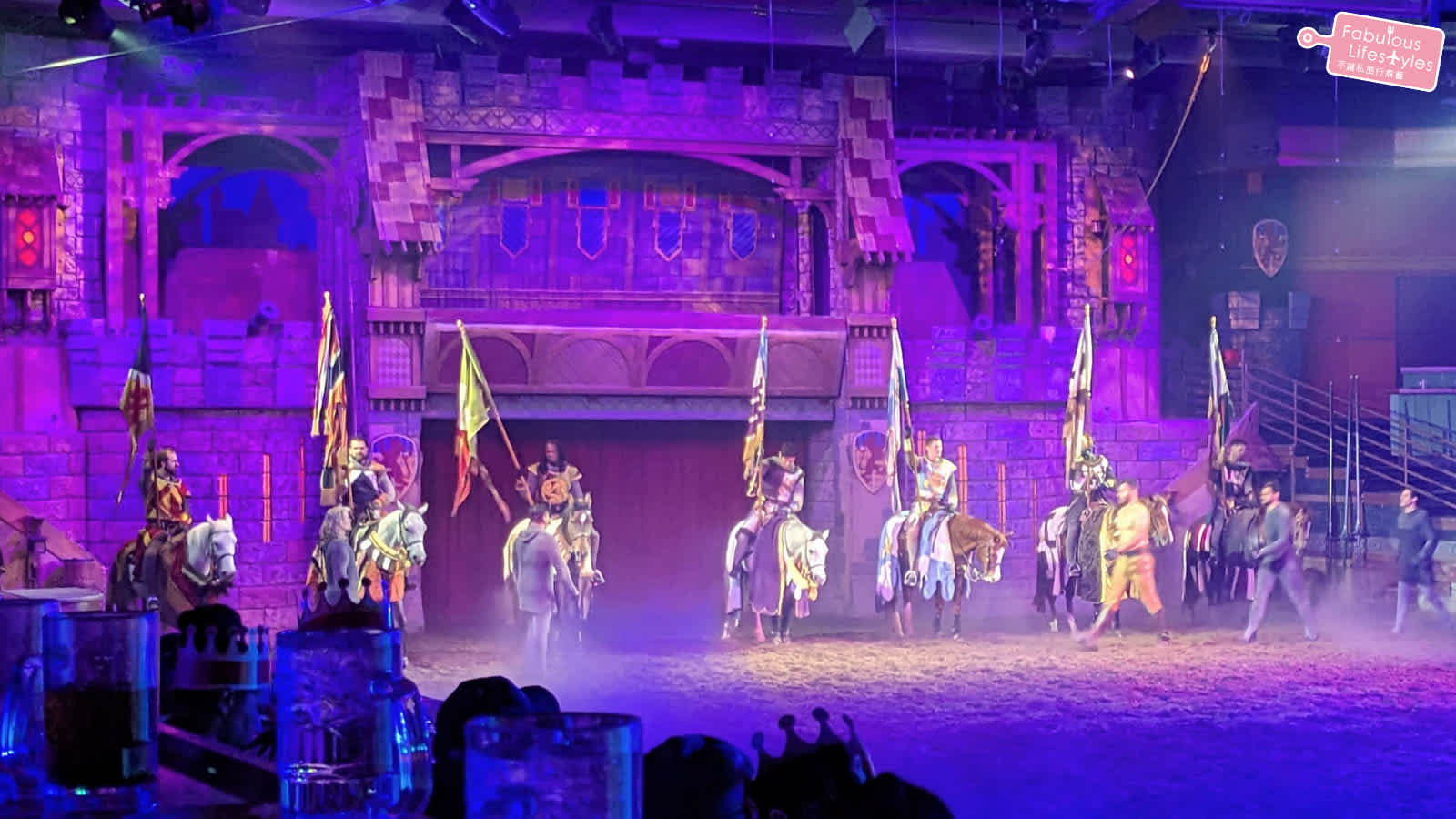 中古騎士華麗登場!!!這個秀的主軸就是這些騎士的一場錦標賽~演員會主動和觀眾互動讓觀眾依照座位的區域幫所屬王國大聲喝采,整個體驗就是融入感十足~