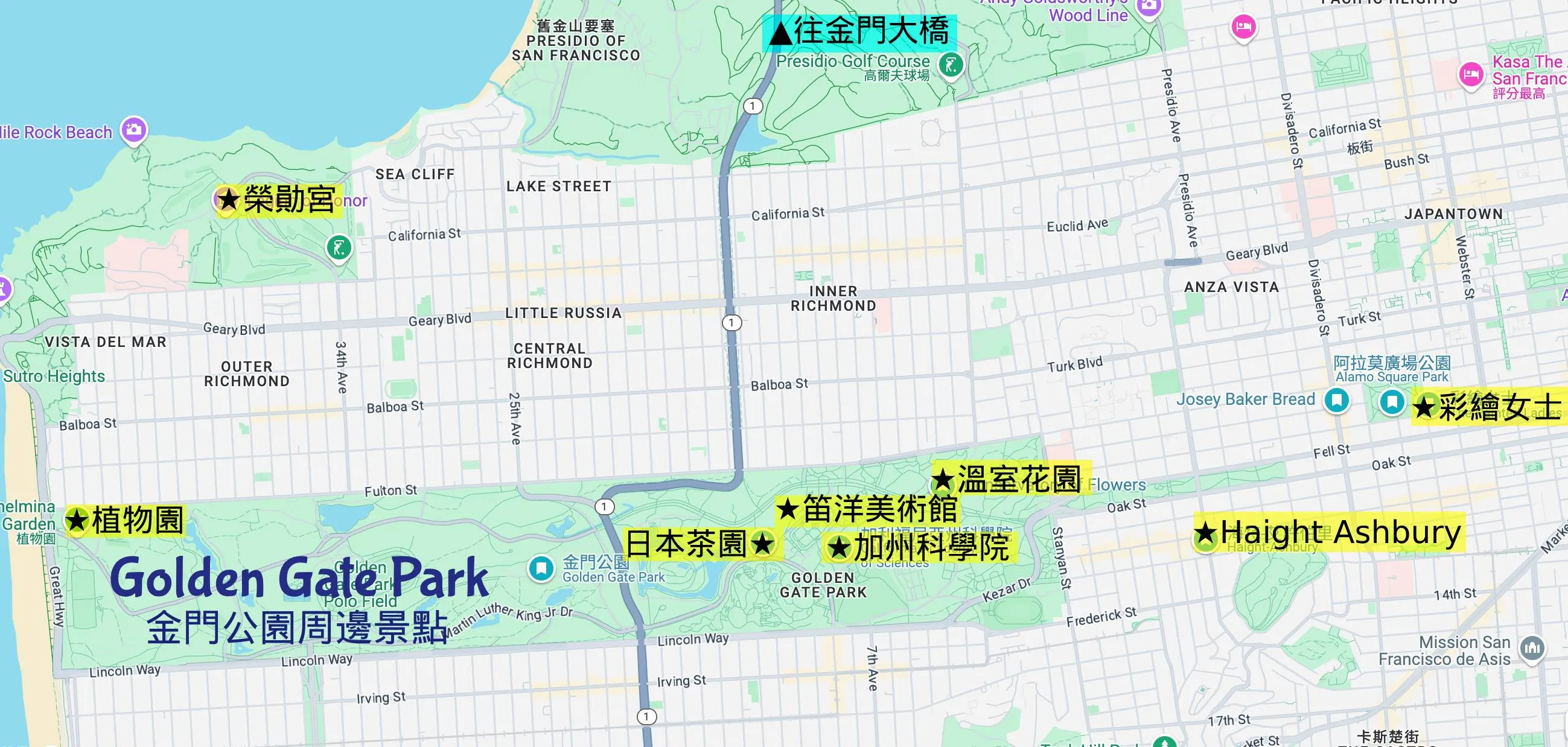 | 第一天 | 城市之光書店➡️泛美金字塔拍照點➡️彩繪女士➡️金門公園/日本茶園➡️金門大橋觀景點➡️尤達大師噴泉➡️藝術宮➡️Crissy Field海灘➡️漁人碼頭漁人碼頭招牌➡️機械博物館➡️Boudin Bakery晚餐 | 觀光巴士 |