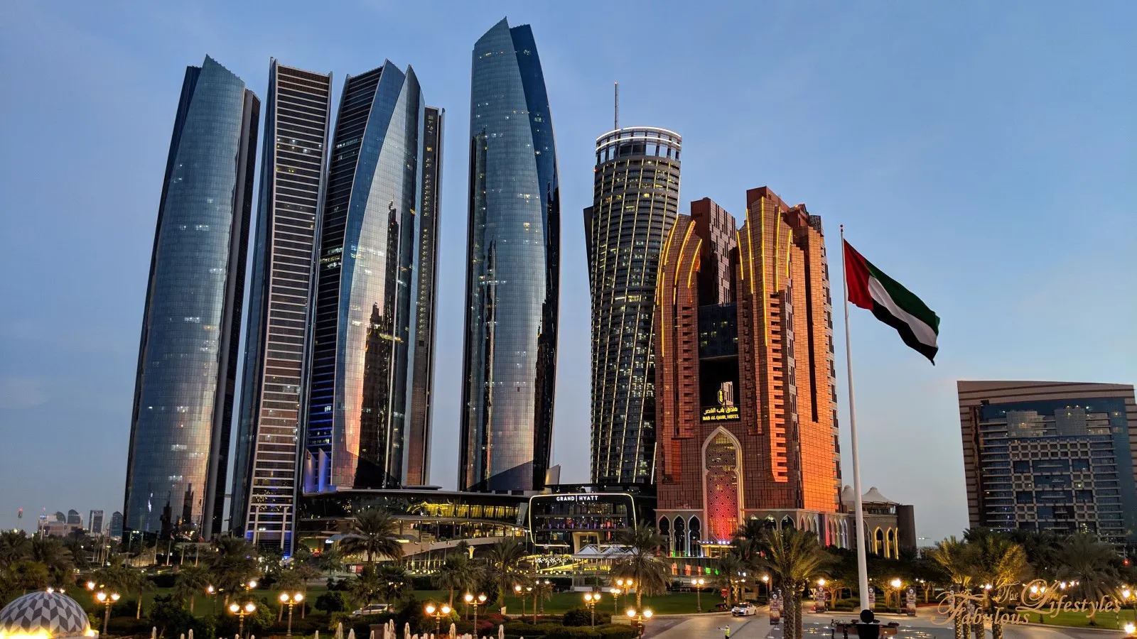 The faintly lit Etihad Towers paired with flags fluttering in the wind offers a completely different, yet beautiful, vibe.