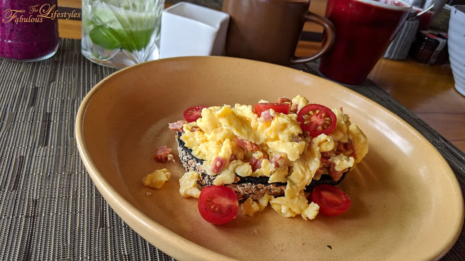 When we saw this Chorizo Scrambled Egg, we couldn't help but admire the chef's incredible plating skills! Who knew you could make such a common hotel breakfast dish look this stunning? It starts with a base of black charcoal bread, topped with bright yellow scrambled eggs and vibrant red cherry tomatoes. The contrast of black, red, and yellow is perfect. It instantly elevated a simple plate of scrambled eggs into something so luxurious!