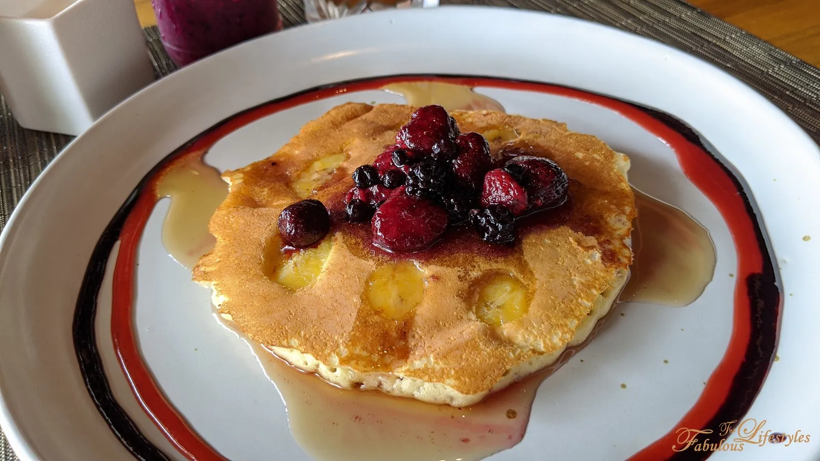 Banana Pancake with Maple Syrup. The bananas 🍌 are baked directly into the pancake! It's topped with mixed berries, and the edge of the plate is elaborately drizzled with berry compote. The pancake itself isn't overly sweet, relying perfectly on the natural sweetness of the bananas. The slightly tart berries cut through any richness, making it very enjoyable and tasty!