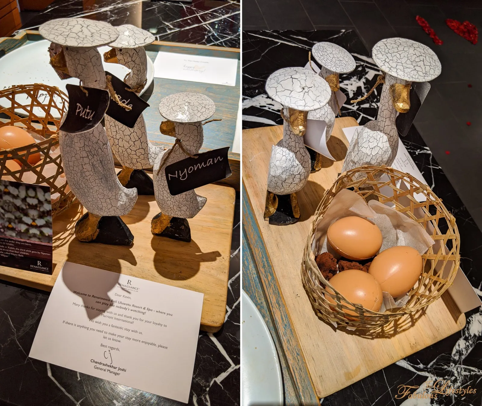 Three little geese wearing bamboo hats were lined up in a row, with black name tags around their necks reading "Putu", "Made", and "Nyoman". The Renaissance Navigator who escorted us to our room explained that these are the most common names given to the first, second, and third children in Indonesian families. So, the eldest child is often named Putu, the second Made, and the third Nyoman! The ever-curious Kevin suddenly blurted out, 👉🏻 "What about the fourth?" The Navigator's response was surprisingly adorable—she said the fourth, fifth, and sixth don't have names yet because they are still too little and are just the eggs sitting on the side~ Hahahaha 😆 By the way, those three geese, the bamboo basket, the eggs, and the chocolates are all meant to be taken home!!! We really loved how they presented this welcome gift in such a cute and culturally meaningful way! Isn't even the welcome gift completely Balinese style?