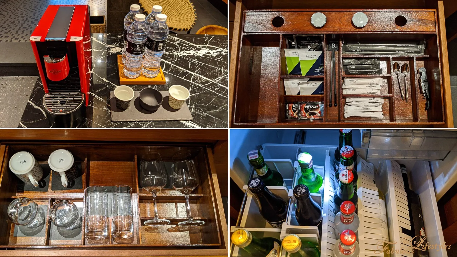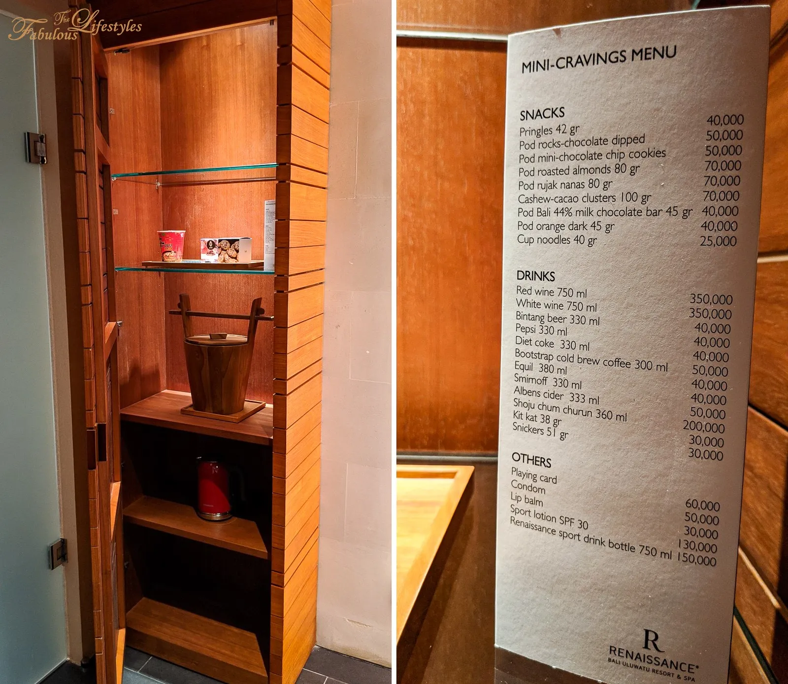 The Mini Bar, ice bucket, and kettle are all neatly hidden away inside the cabinets! Here's a quick look at the price list for the snacks and alcohol in the Mini Bar!