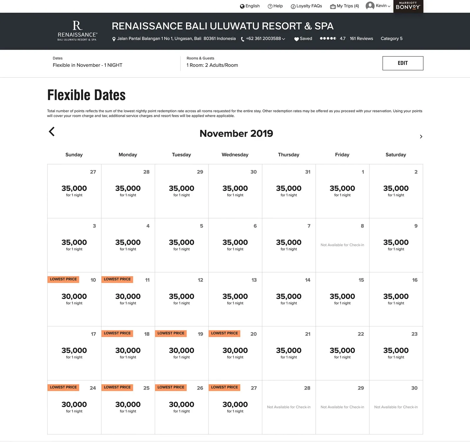 We chose to visit in November — technically Bali's rainy season — though we didn't encounter a single drop of rain! Here's how the point costs varied day by day that month: