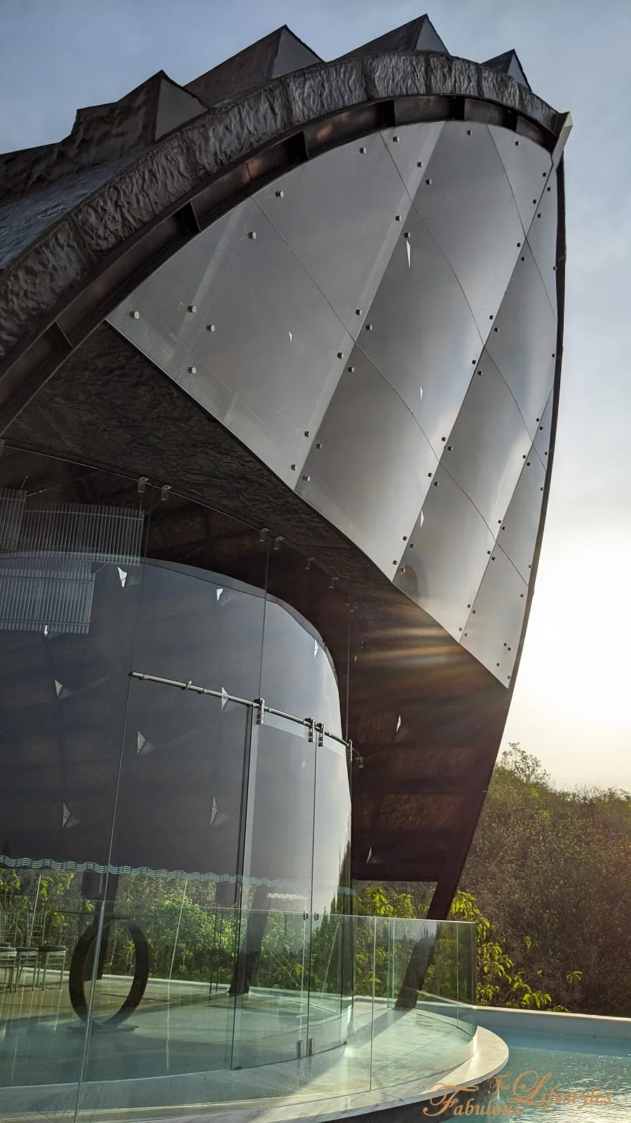 Because it's a bit more tucked away, there are way fewer people here. If you're looking for a quiet swim, this lower pool is a fantastic hideaway! Right next to the pool is a distinctively shaped pavilion.