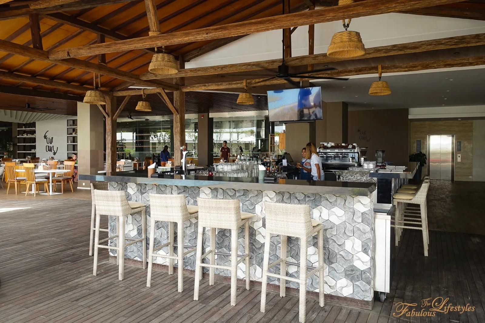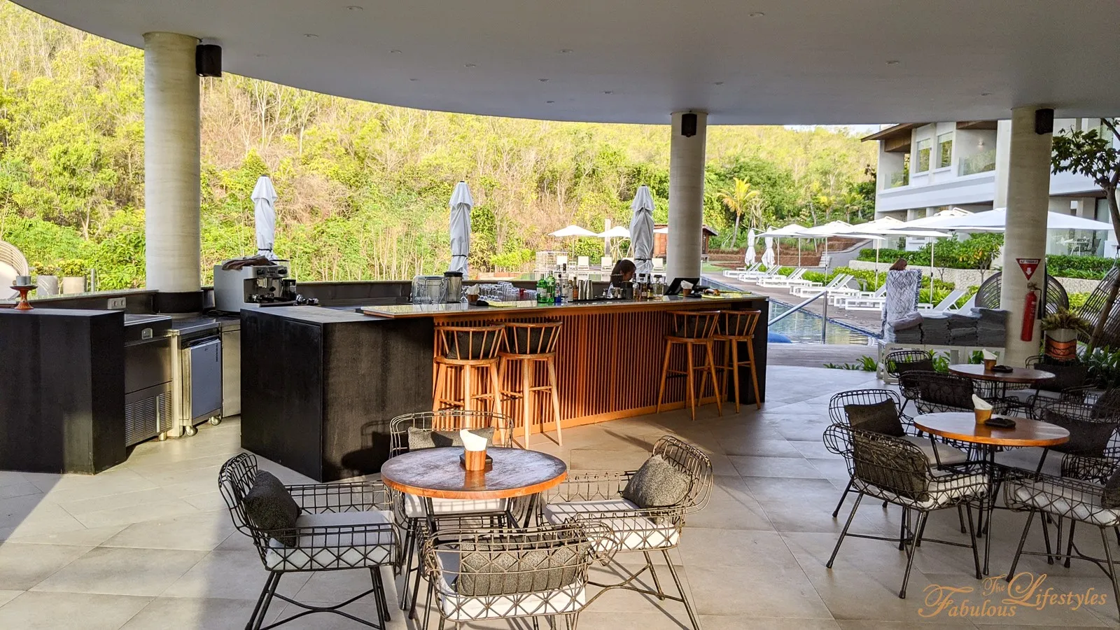 Besides standard dining tables, there's also bar seating. It's a great spot to grab a bite and take a break when you're tired from swimming.