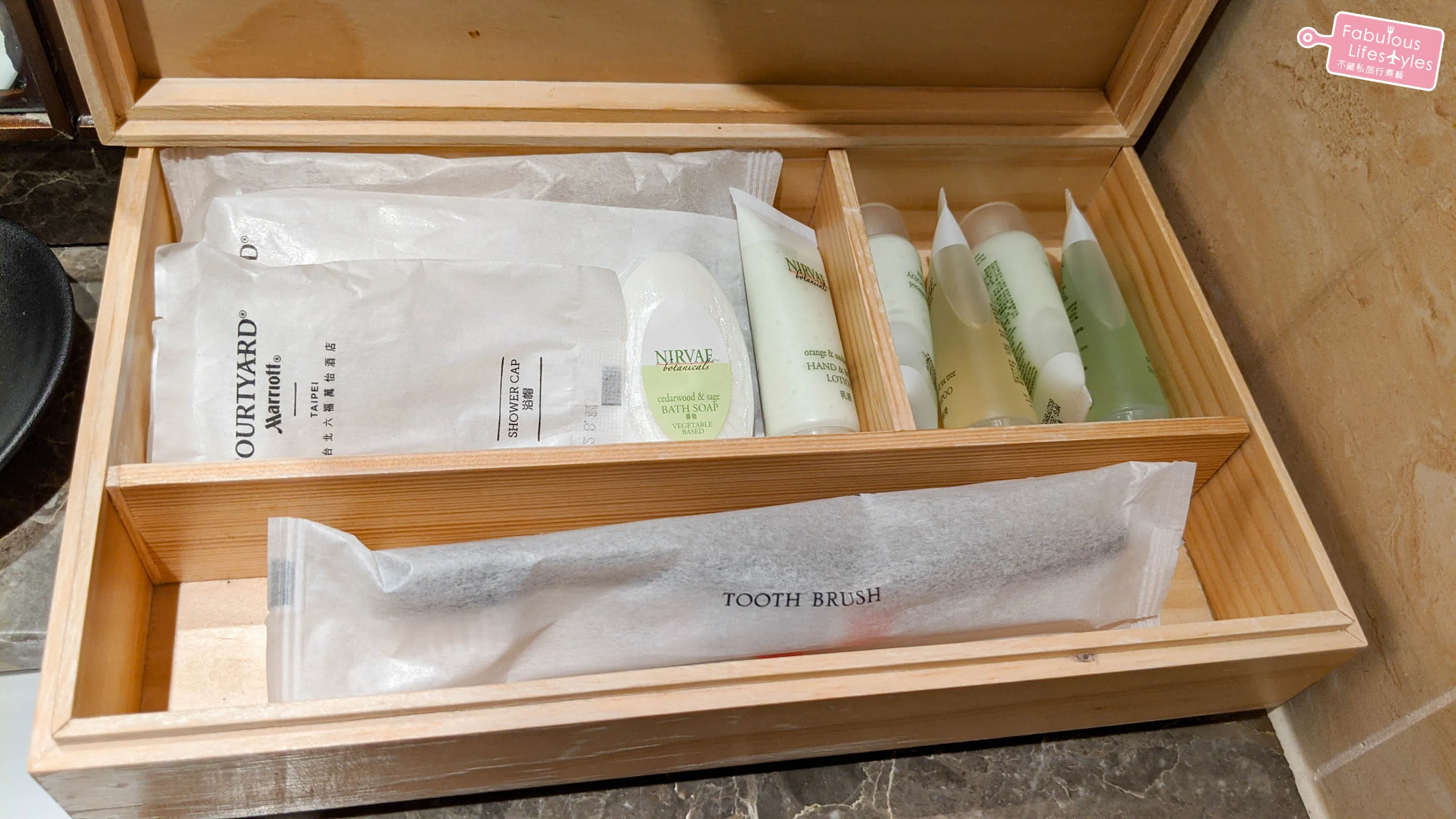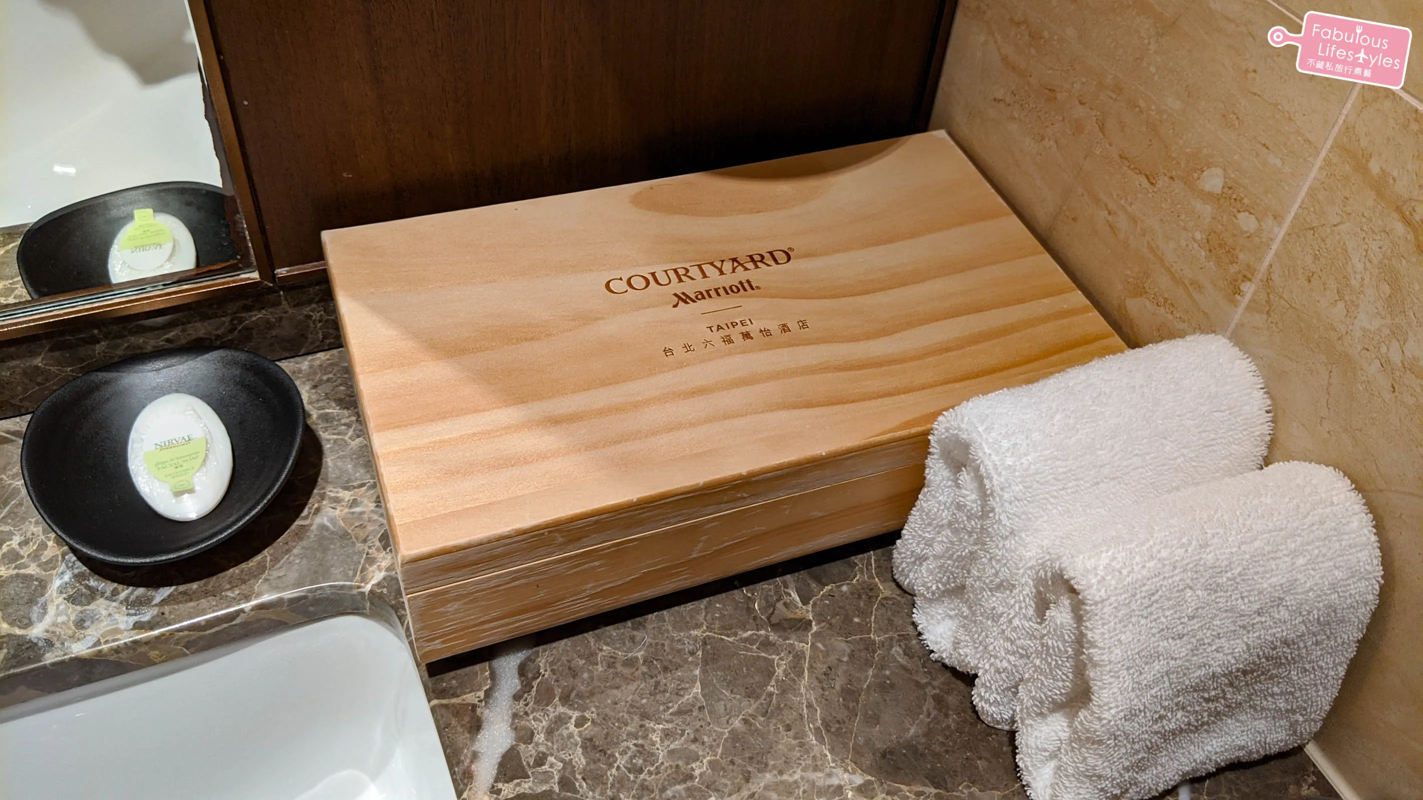 The amenities are neatly placed inside a wooden box engraved with the Courtyard logo, giving the whole setup a wonderfully premium feel.
