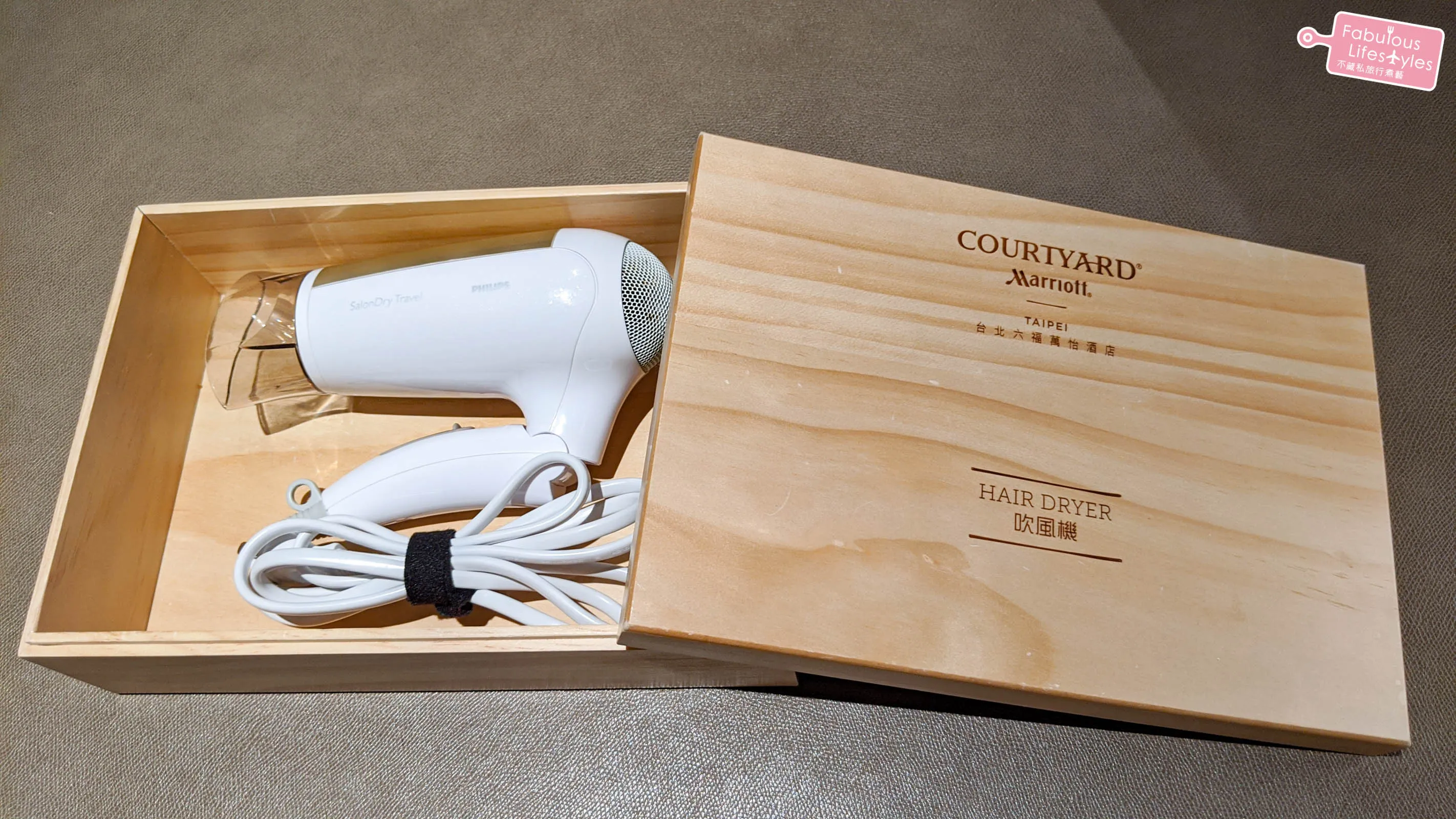 The hairdryer also comes in its own dedicated wooden box, thoughtfully labeled with a little hairdryer icon!