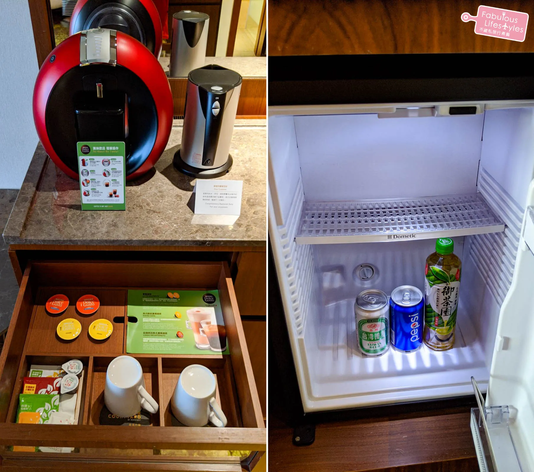 The Mini Bar includes a coffee machine, a kettle, and all the essentials for making tea and coffee. The mini-fridge was stocked with a bottle of Oolong tea, Pepsi, and Taiwan Beer!