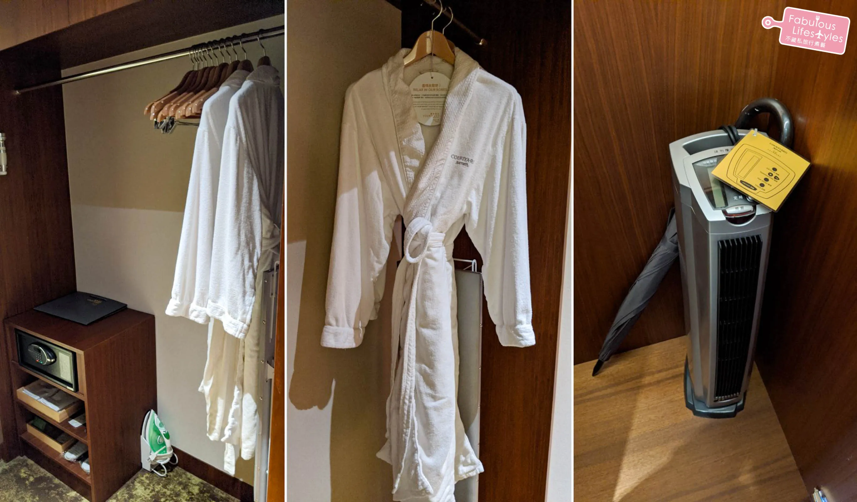 Inside the closet, you'll find everything you need: bathrobes, slippers, an iron, an ironing board, and a safe. What was uniquely thoughtful is that they even provided a standing fan!