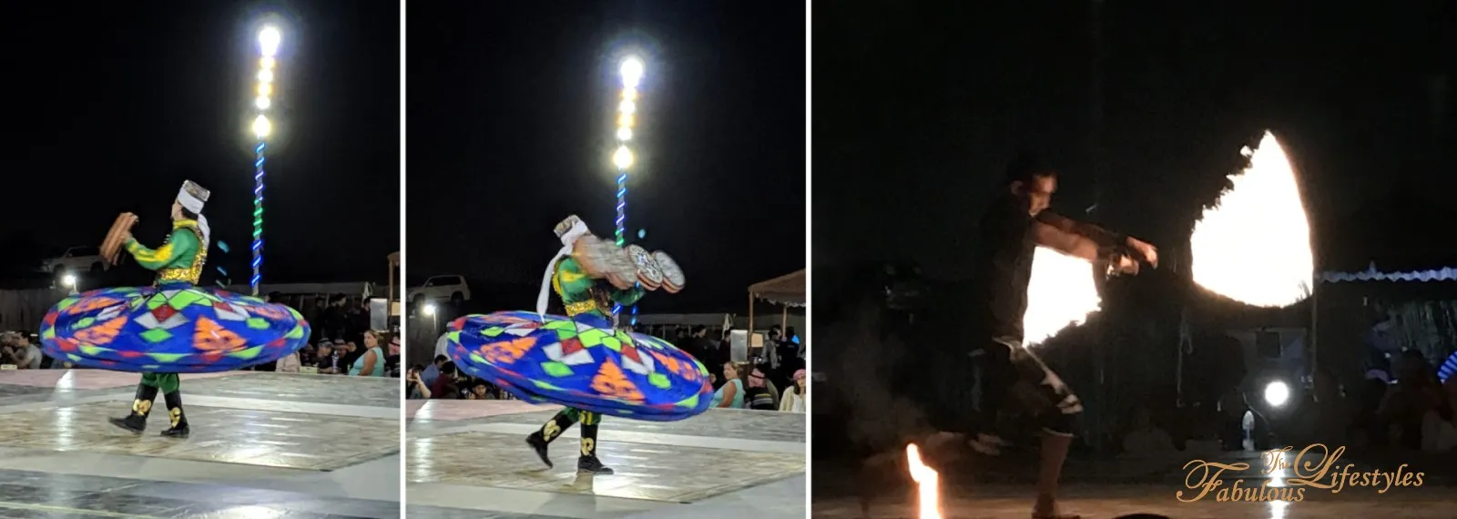 By the time we finally finished the camel ride, there was no time for any of the other activities because it was already dark and dinner had begun! When we went to grab food, we were handed just a few French fries and two triangular fried pastries. As we nibbled on those, the tanoura dance and fire shows kicked off on stage.