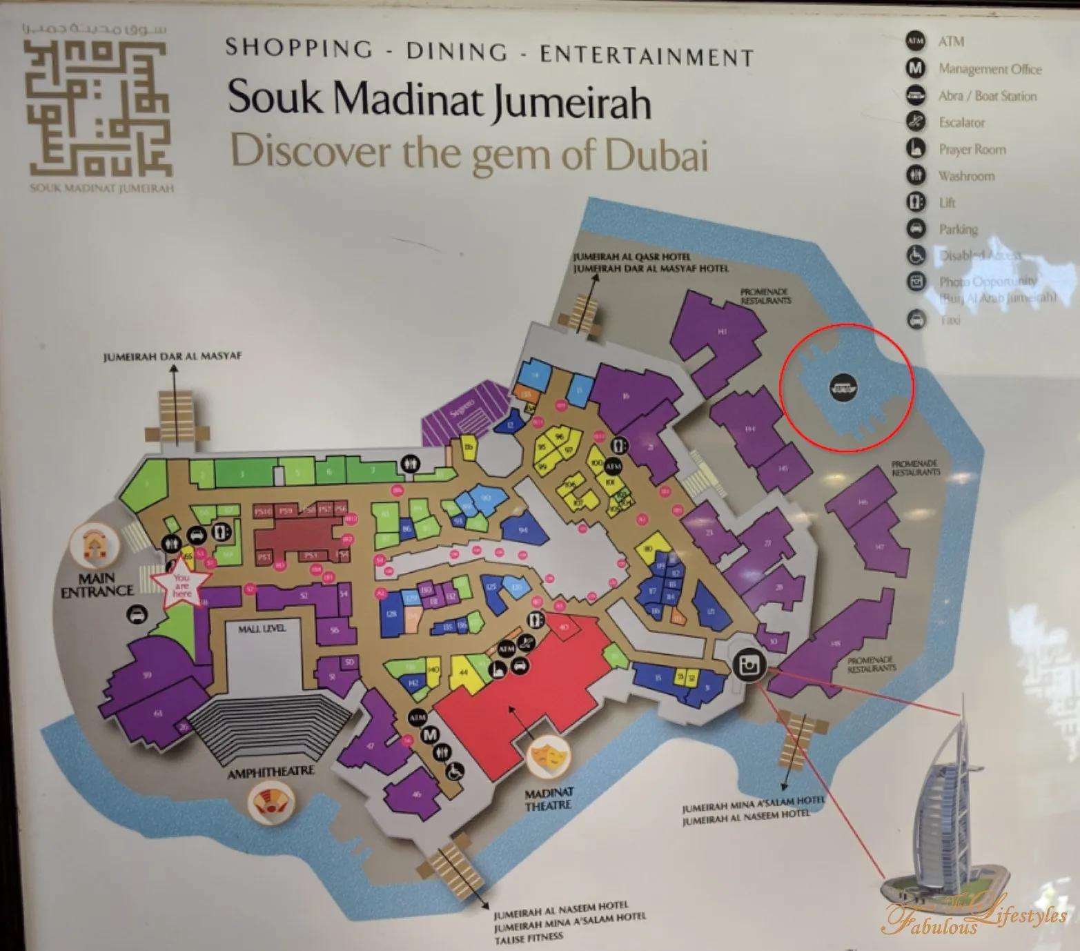 The star on the map shows where you are when you first walk in. We circled the ticket counter and boarding dock in red~ You can just buy your tickets right there on the spot (they accept credit cards!). Also, in the bottom right corner of the map, they thoughtfully marked the "Best spot to photograph the Burj Al Arab". It's not far from the boat dock, so definitely check it out if you have time!