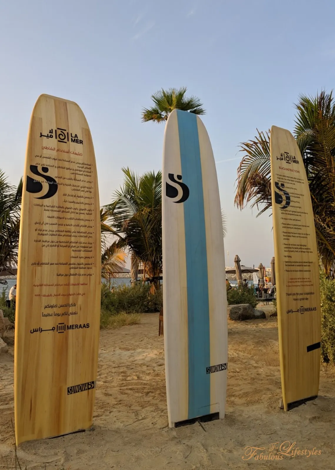 The two of us tourists spent ages taking photos next to these surfboards. It was only later, when we took a closer look, that we realized they were actually displaying beach safety rules… Hahaha! ORZ The local Emiratis nearby must have thought we were so silly! 😆😆😆