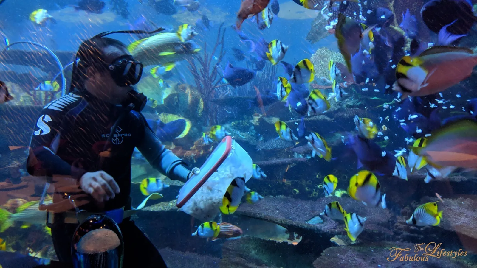 The staff told us that every day around 2:30–3:00 PM, a diver goes into the aquarium to feed the fish. And sure enough… there they were!!!