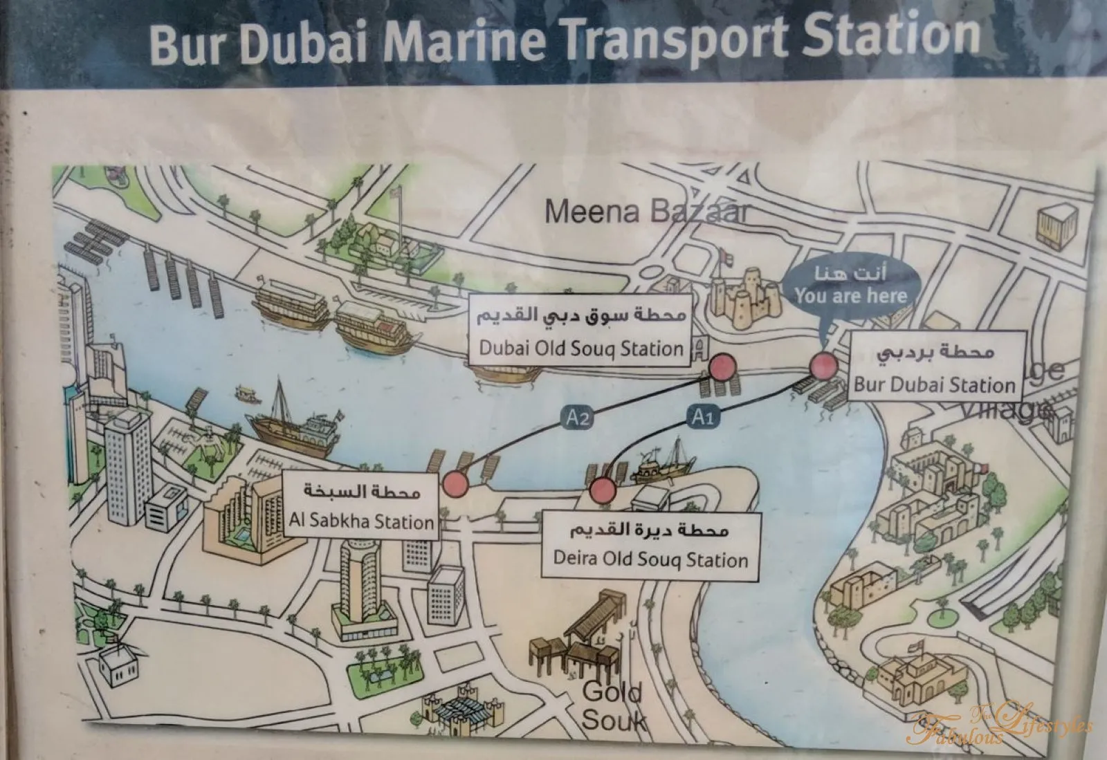 Here's a route map we snapped after arriving at Bur Dubai Station and getting off the boat. There are two lines, A1 and A2, for taking the water bus across the river, and both cost exactly 1 Dirham~ We took the A1 line, which is right next to the Spice and Gold Souks—it's super convenient!