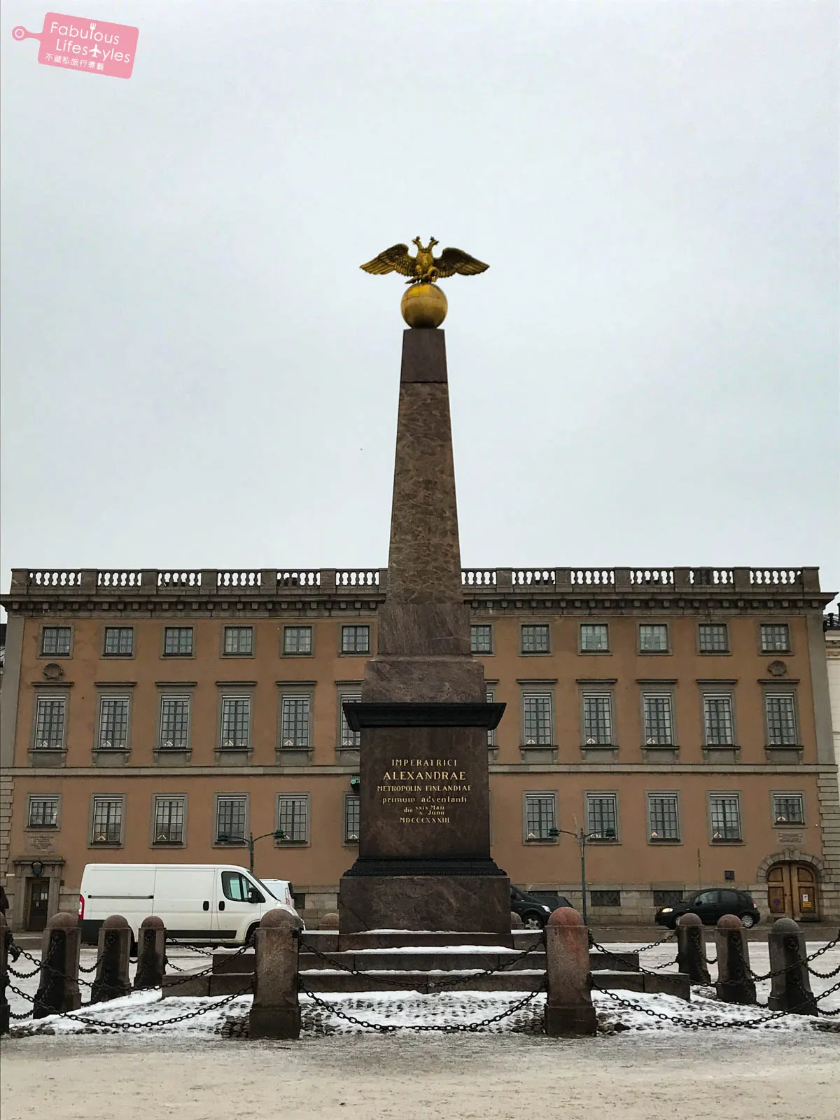 In the center of the Market Square stands Helsinki's oldest monument, the Czarina's Stone. It features a golden double-headed eagle perched on a golden globe. It was erected in 1835 during the Russian era to commemorate the first visit of the Tsar and Tsarina to Finnish soil. The eagle and globe were actually torn down when Finland declared independence in 1917, but they were later restored.