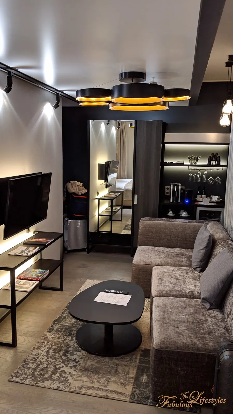 The living area furniture — TV console, coffee table, ceiling light fixtures — all diverged from what you'd expect from a standard hotel. Very Nordic. We half-expected to see IKEA price tags 😄