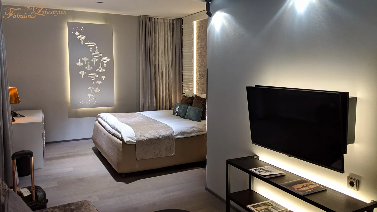 The room makes extensive use of indirect lighting — even the art installations on the walls are backlit.