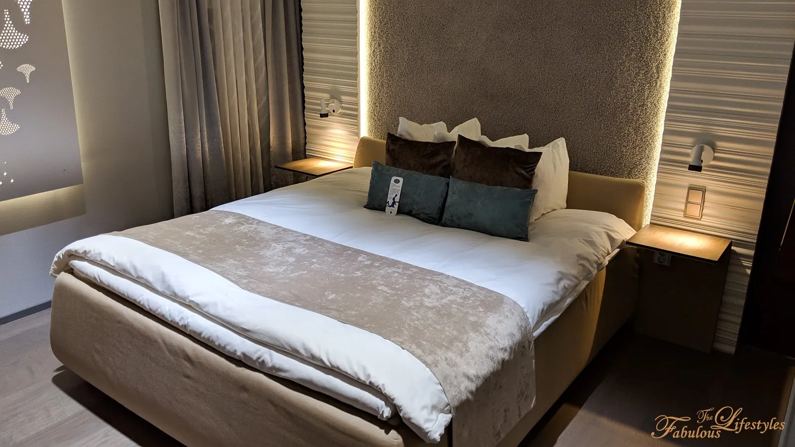 The headboard wall has a distinctive design, while the bedside tables themselves are beautifully minimal.