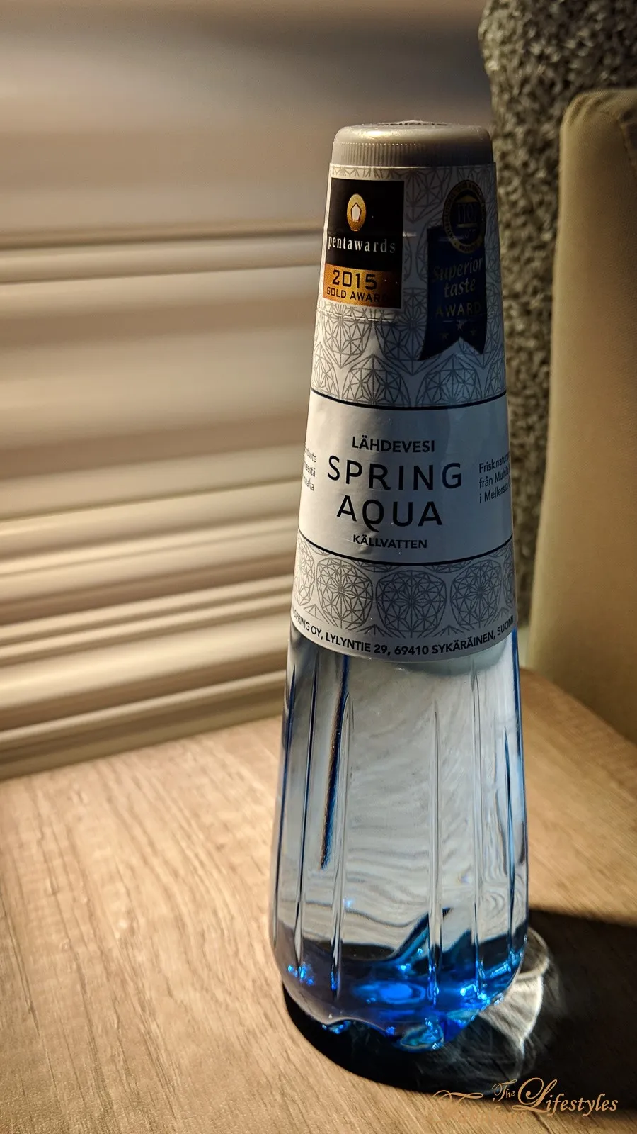 The turndown service placed a water bottle on the bedside — and even the bottle itself had a beautifully designed look.