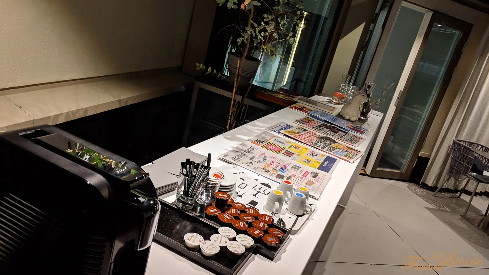 The bar had already closed for the night, but water and a coffee machine were still available for self-service. There were also newspapers and magazines to flip through.