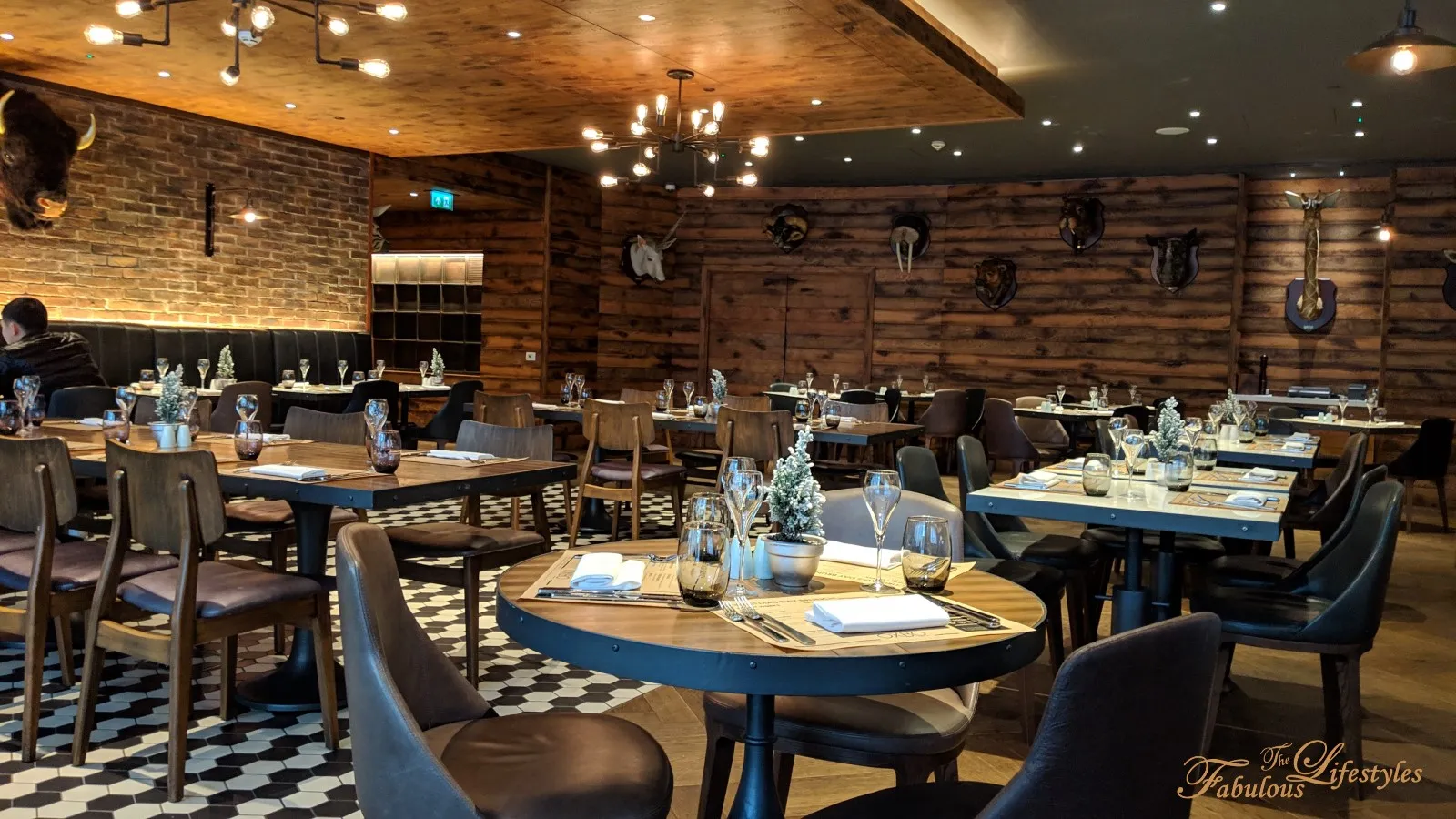 The interior of the restaurant is full of a cozy cabin vibe, making you feel as though you've stepped into a woodland lodge. Because it was Christmas, every table was decorated with a miniature Christmas tree.