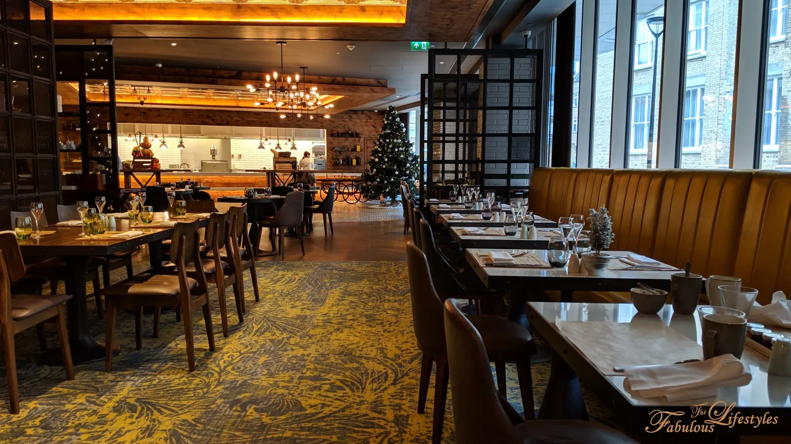 Breakfast is served at OXBO Bankside, the restaurant located right next to the ground floor lobby. Look closely at the snowy Christmas display under the sign—do you spot the little fox again?