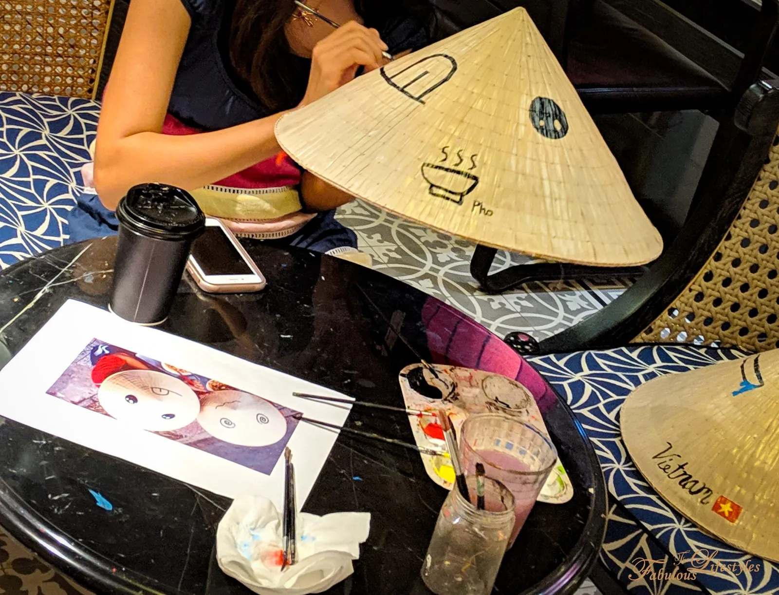 Just like the conical hat painting, the hotel staff provides paints, brushes, and plenty of design templates to choose from! But again, you are totally free to sketch out your own designs. The paint they use is actually amazing! They told us that once it air-dries for a few days, it's completely washable. I was honestly terrified that the black paint we used would bleed and ruin our hard work, so I waited a long time before finally gathering the courage to wash them. But as it turns out, even throwing them in the washing machine didn't cause any fading or bleeding!
