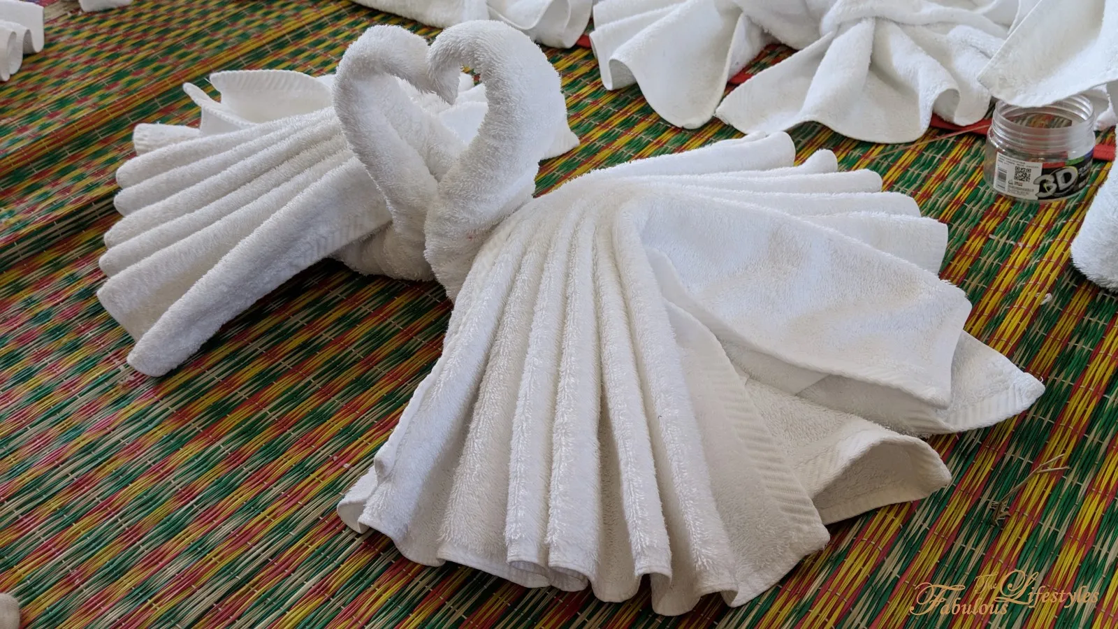 The hotel staff carefully prepared a huge pile of towels of all sizes in the center of the woven mats. There are three different towel sizes used. All the participants sit in a circle as the staff demonstrates step-by-step how to fold various animals, and then it's our turn to practice!