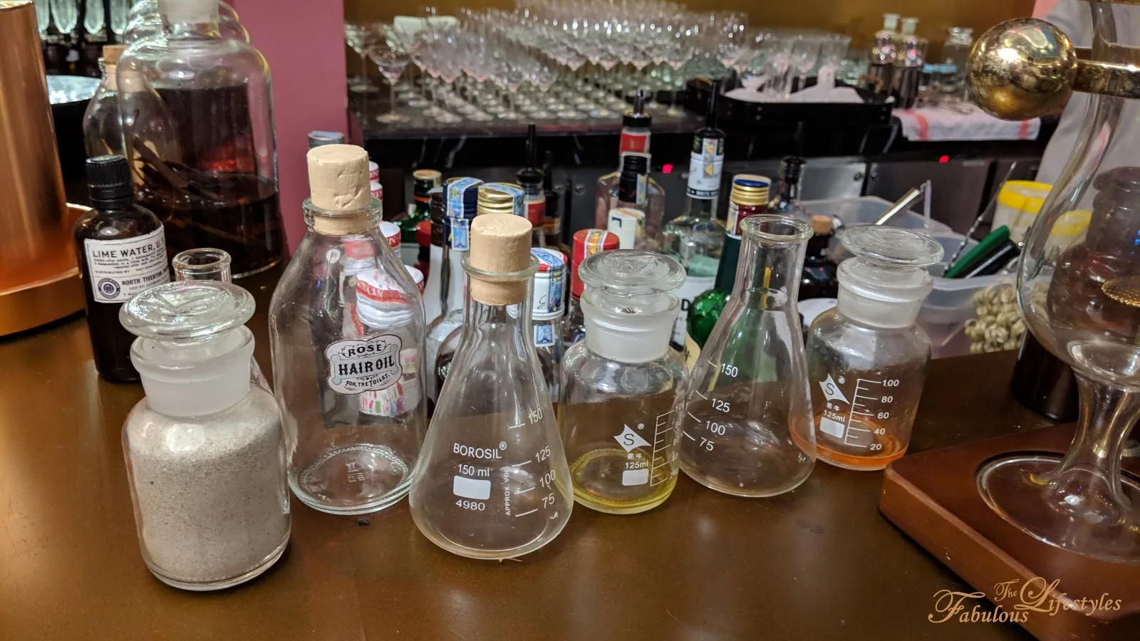 The bar is filled with test tubes, flasks, and all sorts of chemistry lab equipment. Every single piece of decor is perfectly on theme.