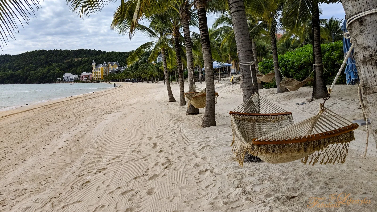 On the beach right in front of the Chemistry Bar, the area with the hanging hammocks is a super popular photo spot! You can capture the entire bay, the pristine white sand, and the European-style architecture of the resort all in one spectacular shot.