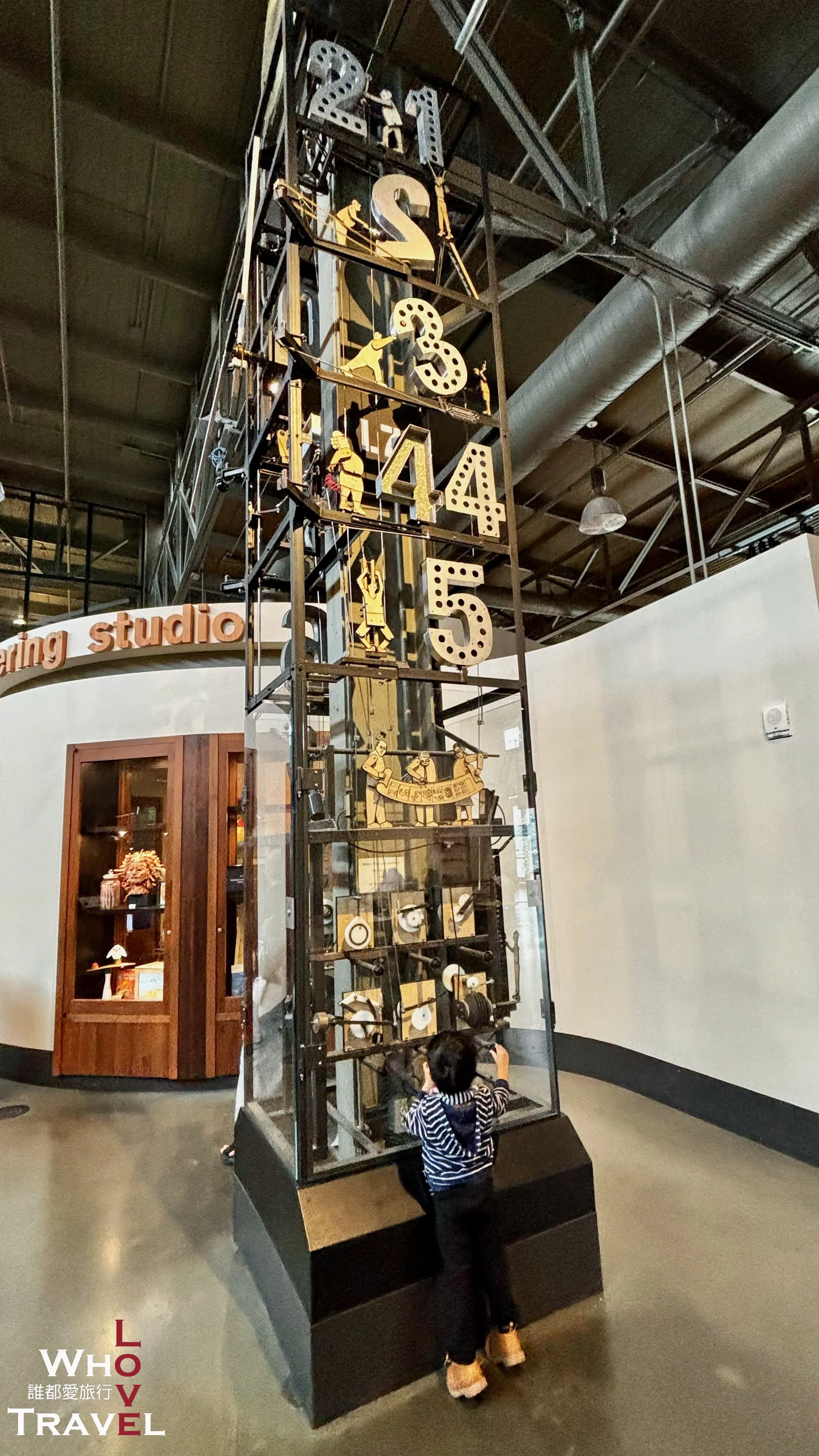 Directly opposite the clock is the incredibly impressive "Exhibit Development Workshop"! You can actually look inside and see all kinds of machinery and tools. We truly admire the developers working here—how do they even dream up and build so many magical exhibits?!