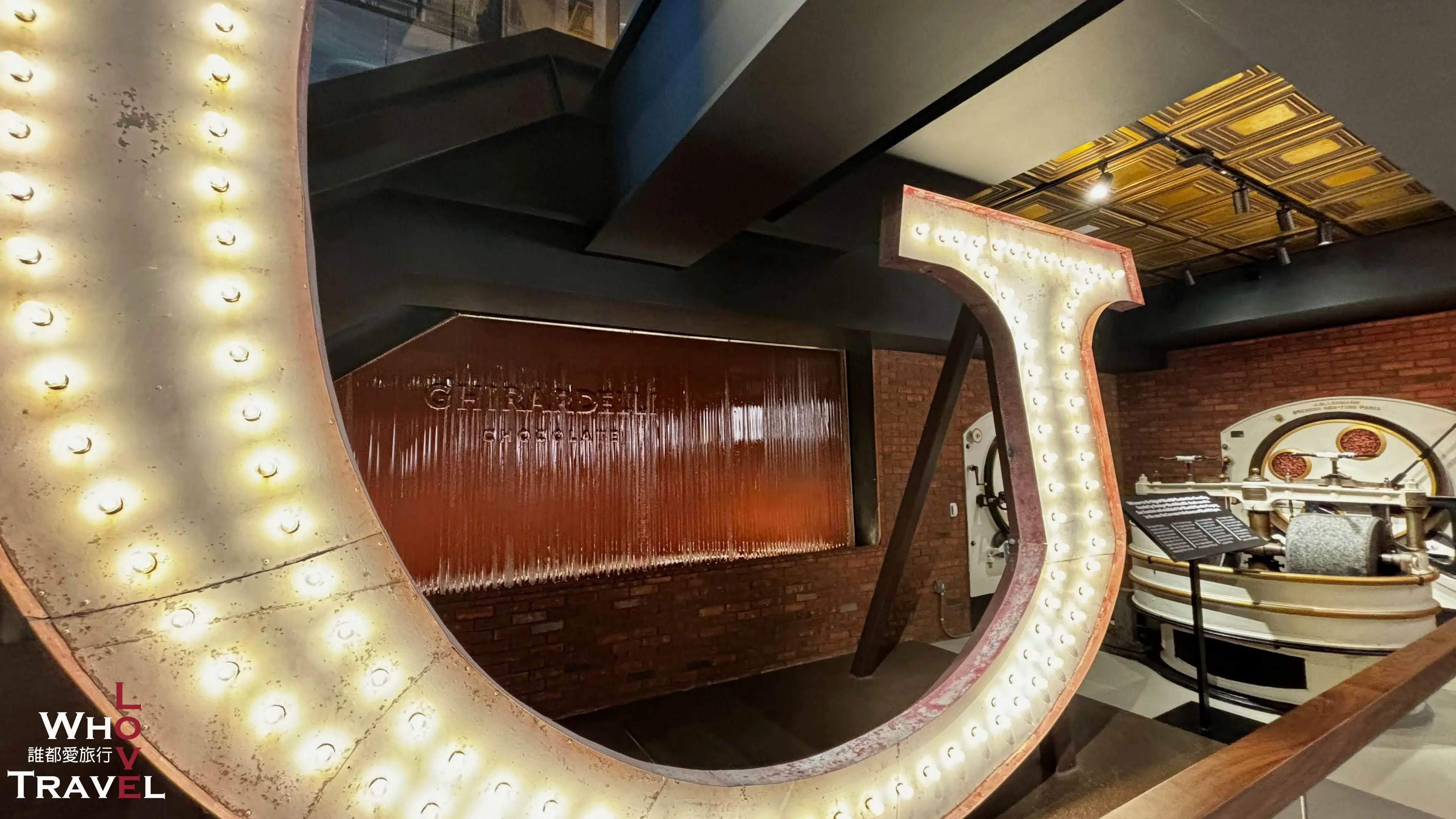 At the very back of the store, there is an entire wall featuring a chocolate waterfall, along with a massive "G" sign! It turns out this chocolate waterfall wall is 16 feet wide and 9 feet tall, making it the largest in the United States! And that 19-foot-tall "G" is the actual giant sign that illuminated Ghirardelli Square during the 1915 Panama-Pacific International Exposition in San Francisco~