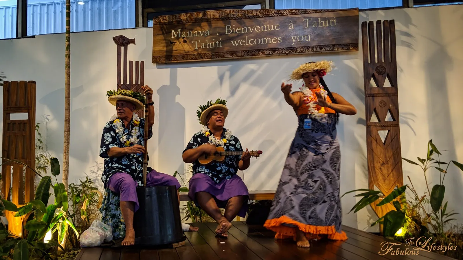 Immediately upon entering, you're greeted by… passionate Tahitian music and dancing!!!! Ukuleles, straw hats, flower crowns, floral shirts, and enthusiastic dancers completely ignited our vacation mood! Oh my gosh, this doesn't feel like an airport at all!