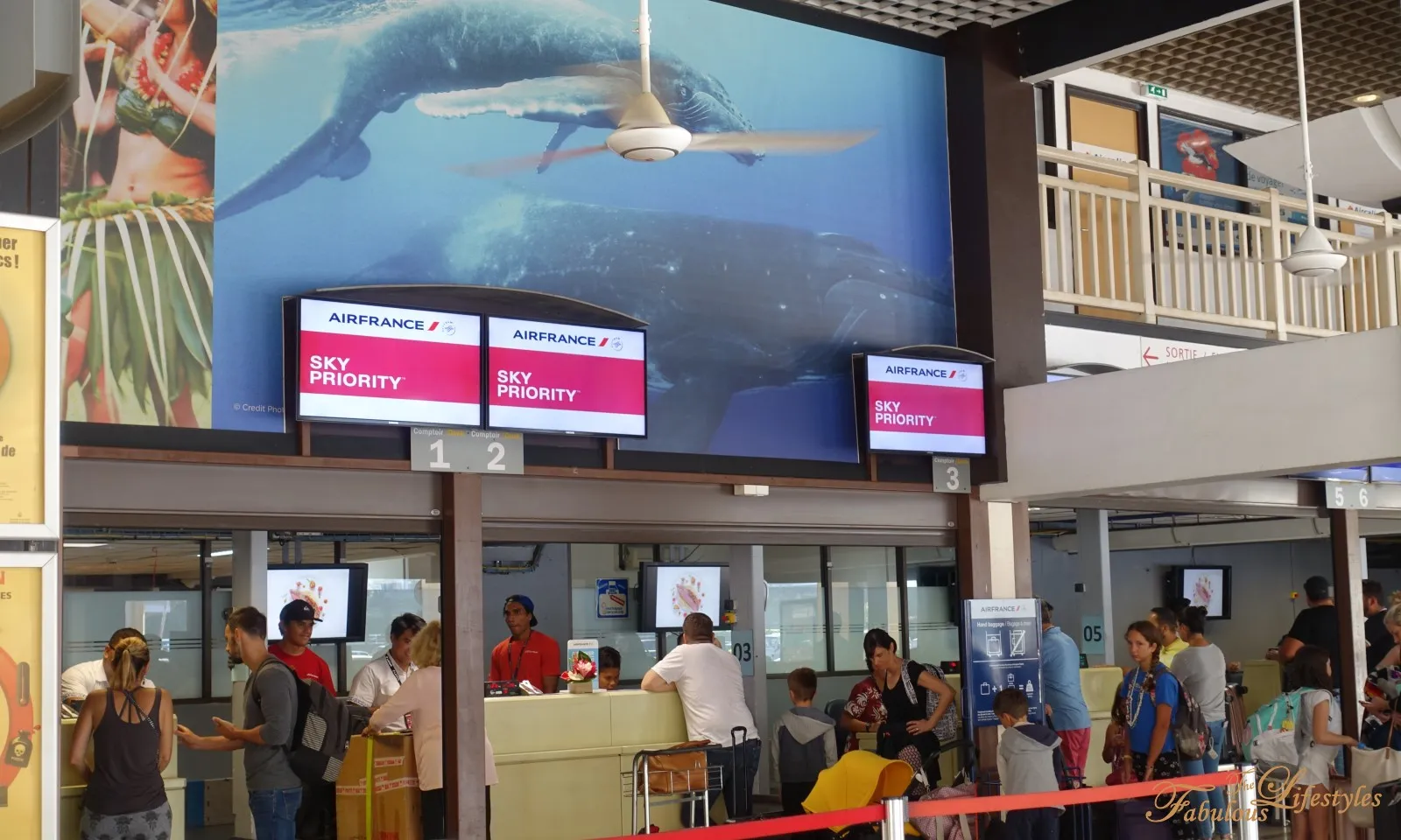Next up, if you're transferring to Air Tahiti to head to other islands, just follow this check-in sign and turn right →