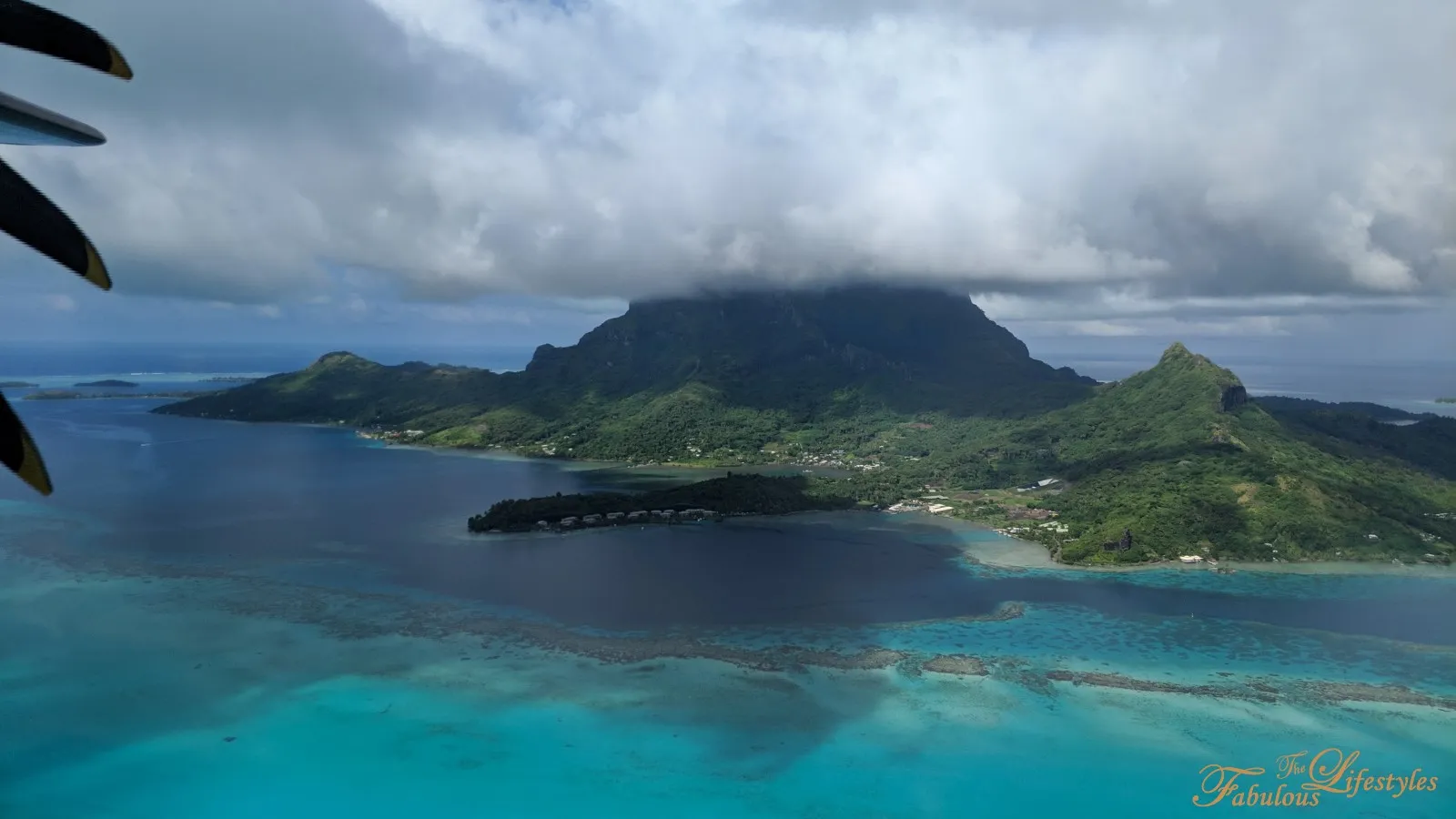 Important Tip! If you're flying Air Tahiti to Bora Bora, remember to sit in the front left or rear left seats. The view from the middle seats will be blocked by the wings. Cherry's personal favorite is the front left seat! Not only is the view out the window unobstructed by the wing, but you can also see the spinning propellers. It seemed like it had rained before our departure, and I'm not sure if it was because of that rain (maybe it washed the windows extra clean?), but the views during takeoff that day felt exceptionally crystal clear.